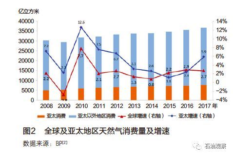 中国石油集团经济技术研究院预测,2016-2030年,全球天然气需求年均增速将达到2.0%,可望增加1.1万亿立方米,增幅32%,2030年总量达到4.57万亿立方米。同期,亚太天然气需求年均增速3.2%,可望增加3950亿立方米,增幅55%,占全球需求增量的36%,2030年将达到1.11万亿立方米[10]。
