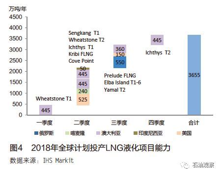 LNG市场的发展增加了天然气在全球的可获得性。2016年以来,得益于前期澳大利亚(2009-2012)和美国(2012-2016)LNG投资项目的上马,全球LNG液化能力进入突增期,2016和2017年分别增长2800万吨和3400万吨[14]。2018年全球共有10个天然气液化项目计划投产,合计产能3655万吨/年(见图4),总产能比上年上升11%,全球天然气液化能力将增至3.88亿吨/年[14]。以上产能增长将延续至2020年,增速高于同期全球LNG进口需求,2020年全球LNG供应剩余量将扩大至1800万吨/年左右[9]。