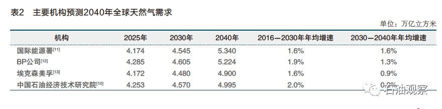 2030年之前,全球天然气需求将保持较快增长,2030年之后增速放缓,各机构对2040年前全球天然气需求均有预测(见表2)。