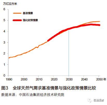 未来天然气需求的增长将依赖政策驱动。如果环境政策力度减弱(例如,煤改气力度减小),将降低天然气需求增长及其在一次能源中的占比,煤炭占比增加。如果强化环境政策(例如,推进可再生能源发展、加快推行低碳能源结构、严格执行巴黎协议),天然气由于其清洁性和稳定性供应,2030年之前的需求仍高于基准情景,之后因可再生能源占比增加而增速放缓(见图3)[10]。