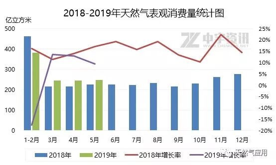2019年上半年天然气依旧保持高速增长,除了1-2月份由于去年冬季爆发增长导致消费基数太大,才使得今年增速出现负增长,3-5月天然气同比增速依旧在10%上下。但是3-5月天然气环比增速几乎为0,也就是说由于前几年天然气的高速发展,在天然气大需求的情况下今年稳步前进,扩张速度放慢。