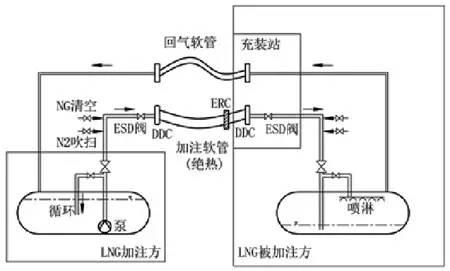 可行的LNG加注解决方案的设计取决于对安全性、可操作性、经济性三者的平衡。图6为一典型水上LNG加注系统。该系统的工作原理为:用泵将LNG通过加注软管(或加注臂)泵送到接收方储罐中。在软管的两端都装有紧急切断阀(ESD),如果发生泄漏或操作异常,ESD可自动或手动关闭,为防止过压,ESD的响应时间在30s左右。当ESD关闭时,为防止压力振荡,储罐配备有自循环系统进行降温和降压。为防止加注方与接收方之间过大的相对运动,在软管上装有紧急脱离装置(ERC)。加注软管两端采用干式快速接头(DryDisconnectCouplings,DDC)以防止泄漏。在加注之前,加注软管需要用LNG的蒸发气进行吹扫和预冷,加注之后,软管中的LNG要排干,然后用氮气吹扫加注软管和回气管。