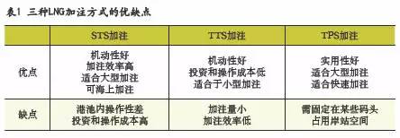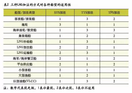 表1列举了上述各种加注方案的优缺点,表2列举了各种船舶的适用方案。