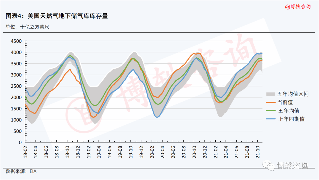 截至11月19日,美国天然气地下储气库库存量降至36230亿立方英尺,比去年同期水平低3200亿立方英尺,比5年均值(2016-2020年)低580亿立方英尺。