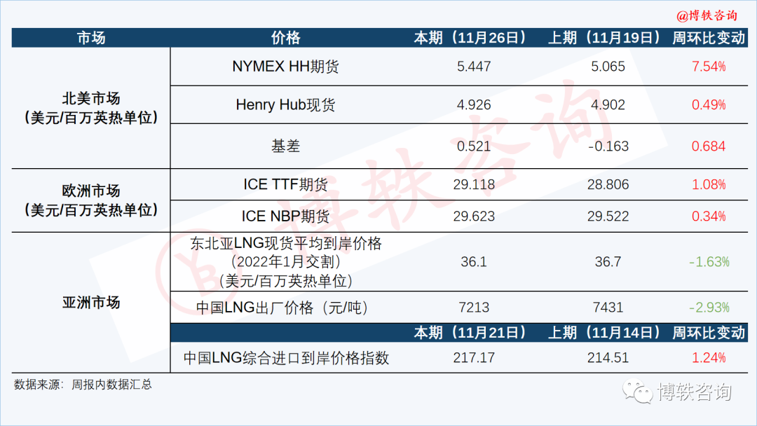 截至周五(11月26日)收盘时,12月交割的NYMEX HH天然气期货合约结算价为5.447美元/百万英热单位,周环比(11月19日)上升0.382美元/百万英热单位,涨幅为7.54%。