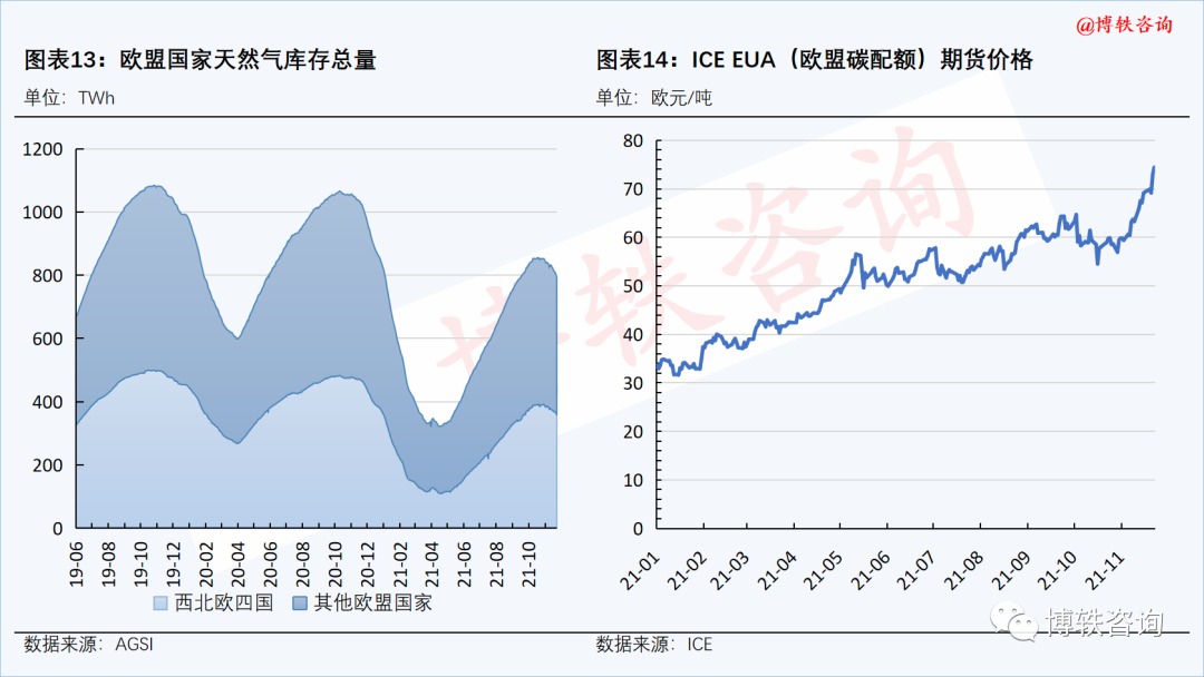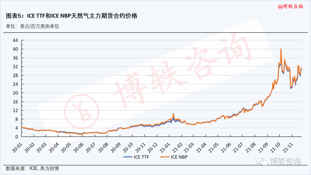 本周,在供应端,美国政府于当地时间11月22日表示,美国将继续针对“北溪-2”管道项目实施制裁,该消息使得本已面临供应短缺的欧洲天然气市场雪上加霜。在需求端,天气预计,西北欧地区气温将持续下滑,居民采暖需求预期提升;而由于风力持续偏低,电厂对天然气的采购需求维持在高位。加之一个月以来碳价的强势上涨,西北欧天然气期货价格仍强势运行。