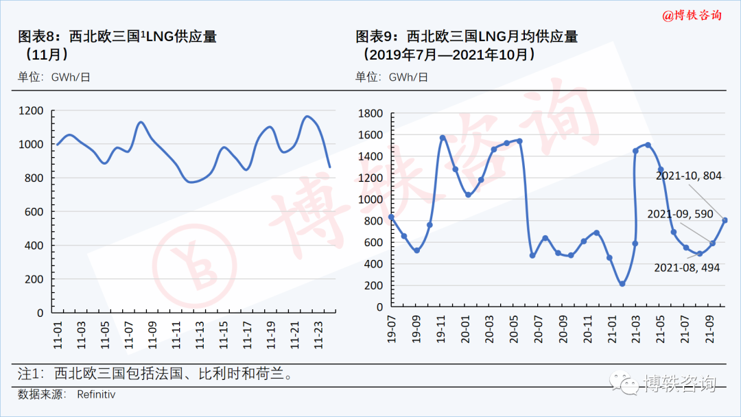 LNG供应量保持在高位。本周四(11月25日),西北欧三国的LNG供应量为922GWh/日,周环比(11月19日)下降178Wh/日。