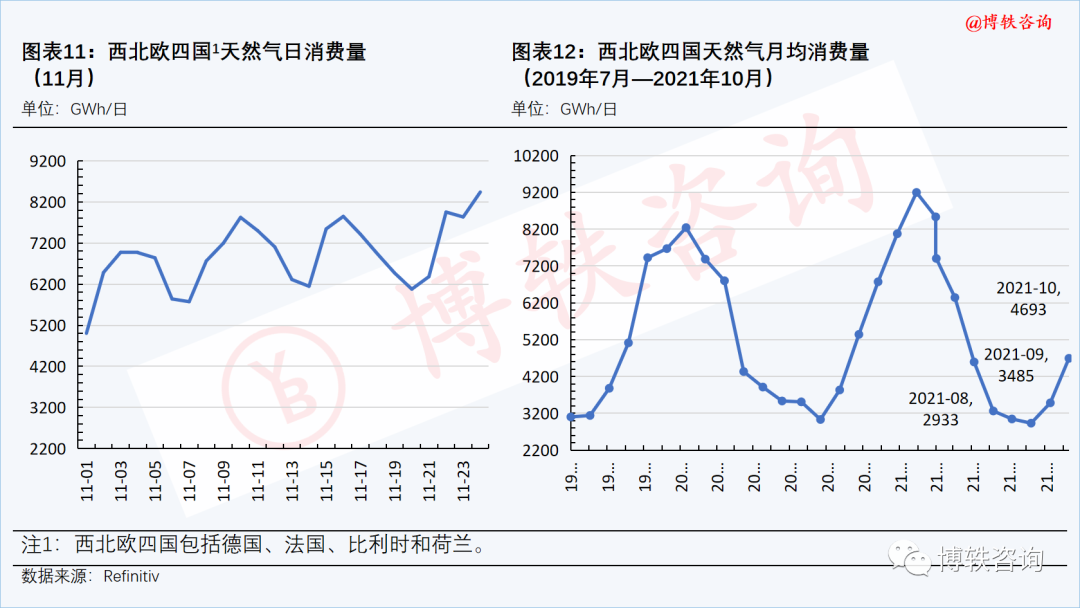 随着气温的不断下降,西北欧四国天然气消费量大幅攀升。本周四(11月25日),消费量为8600Wh/日,周环比(11月19日)上升2131Wh/日。