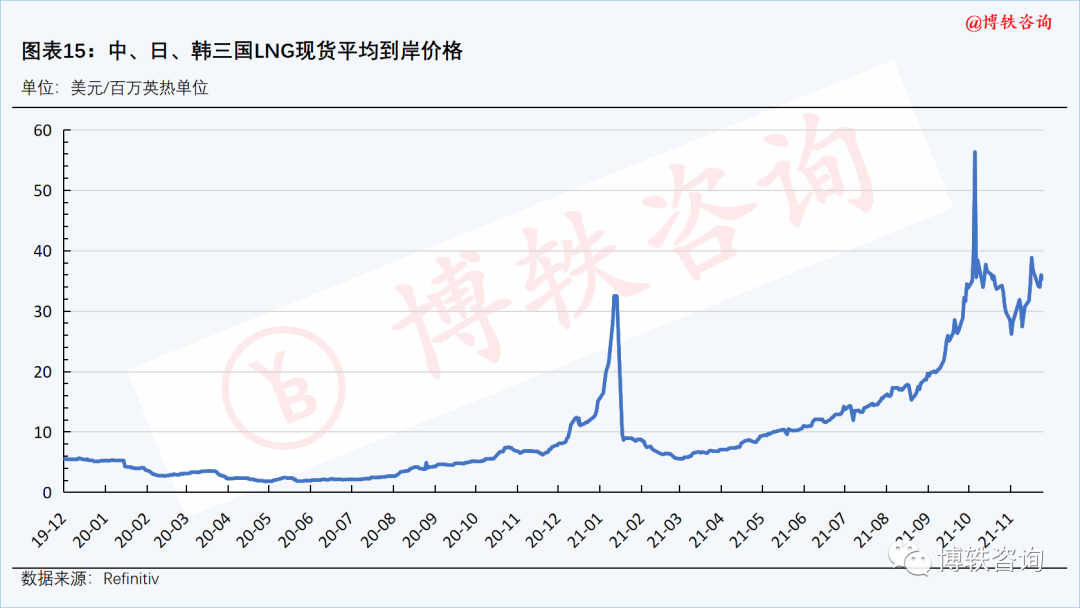 路透社提供的信息显示,本周(11月22日-26日),东北亚地区LNG现货到岸价格(2022年1月交割)为36.1美元/百万英热单位,周环比(11月15日-19日)下降0.6美元/百万英热单位,降幅为1.6%。