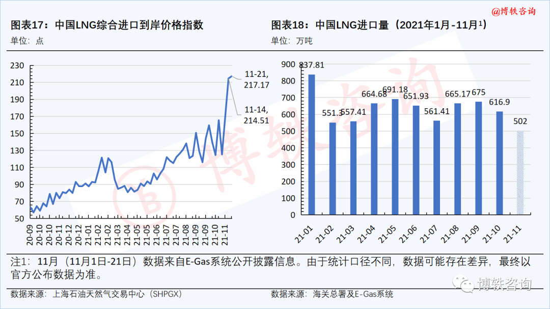 11月15日-21日,中国LNG综合进口到岸价格指数为217.17(C.I.F,不含税费、加工费),周环比(11月8日-14日)上升1.24%,同比上涨166.30%。
