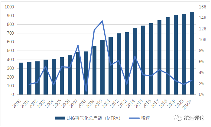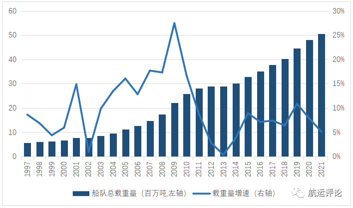 图3 1996年-2021年LNG船队总载重量及增速