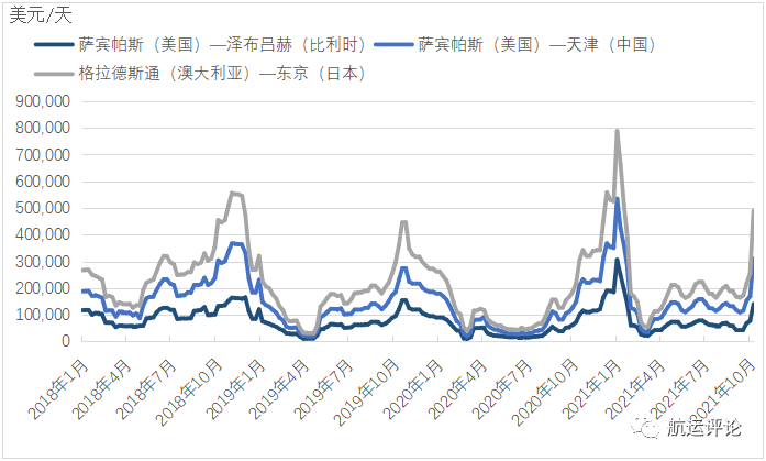 图4 2018-2021年主要LNG海上运输航线的单程运费