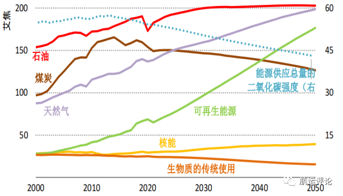 图1 既定政策情境下能源供应总量及二氧化碳排放强度的预测