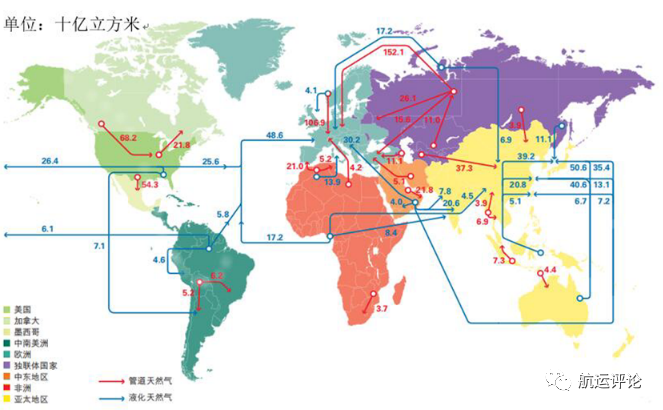 从全球天然气贸易方式来看,天然气贸易分为管道和海运LNG贸易两种方式。2020年管道天然气贸易总量为7758亿立方米,海运LNG贸易量为4879亿立方米,海运LNG贸易量占总天然气贸易量的39.2%。近几年数据显示,海运LNG贸易占比在不断提高,2018年占比34.9%、2019年占比37.7%,2020年受疫情冲击影响仍保持稳定扩张(39.2%),侧面反映出海运LNG贸易强劲增长势头。从全球天然气贸易流向来看,全球共有九大LNG贸易路线,太平洋内部的贸易是全球最大的LNG贸易流动路线,这主要是因为世界上最大的LNG进口地区(例如,中国、日本与韩国)以及最大的LNG出口国(澳大利亚)分布在太平洋地区。