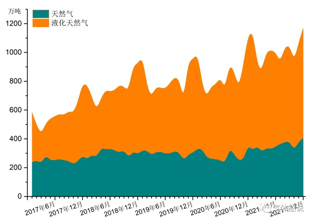 2021年,我国管道天然气进口量为4248万吨,较上一年增长23%,占全年天然气总进口量(管道天然气(NG)+液化天然气(LNG))的35%。