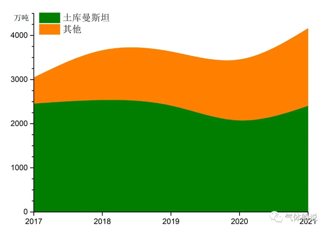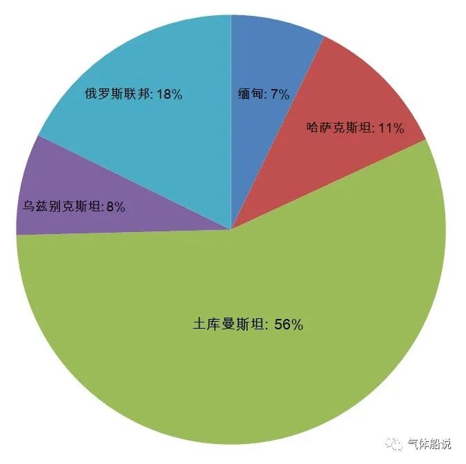 2021年,我国从土库曼斯坦进口天然气2400万吨,占管道天然气总进口量的56%,接下来依次为俄罗斯、哈萨克斯坦、乌兹别克斯坦和缅甸。