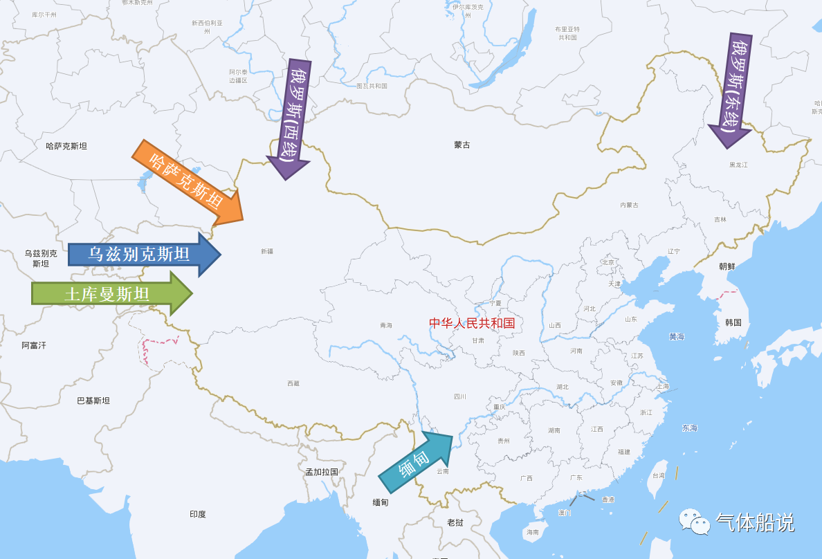 我国进口管道天然气的主要来源为缅甸、乌兹别克斯坦、土库曼斯坦、哈萨克斯坦和俄罗斯等。