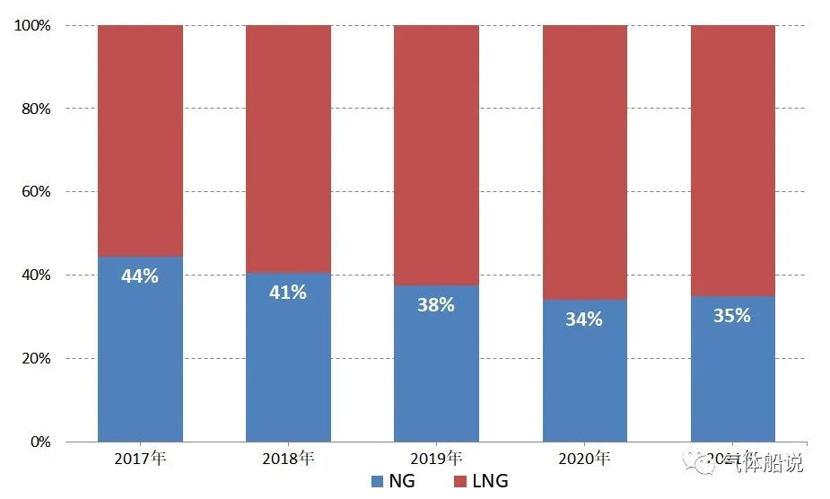 相比之下,2017年以来我国管道NG贸易增长总体表现较为平稳,总体增速要低于LNG贸易量。管道天然气贸易量占比从2017年的44%稳步下降为2021年的35%。