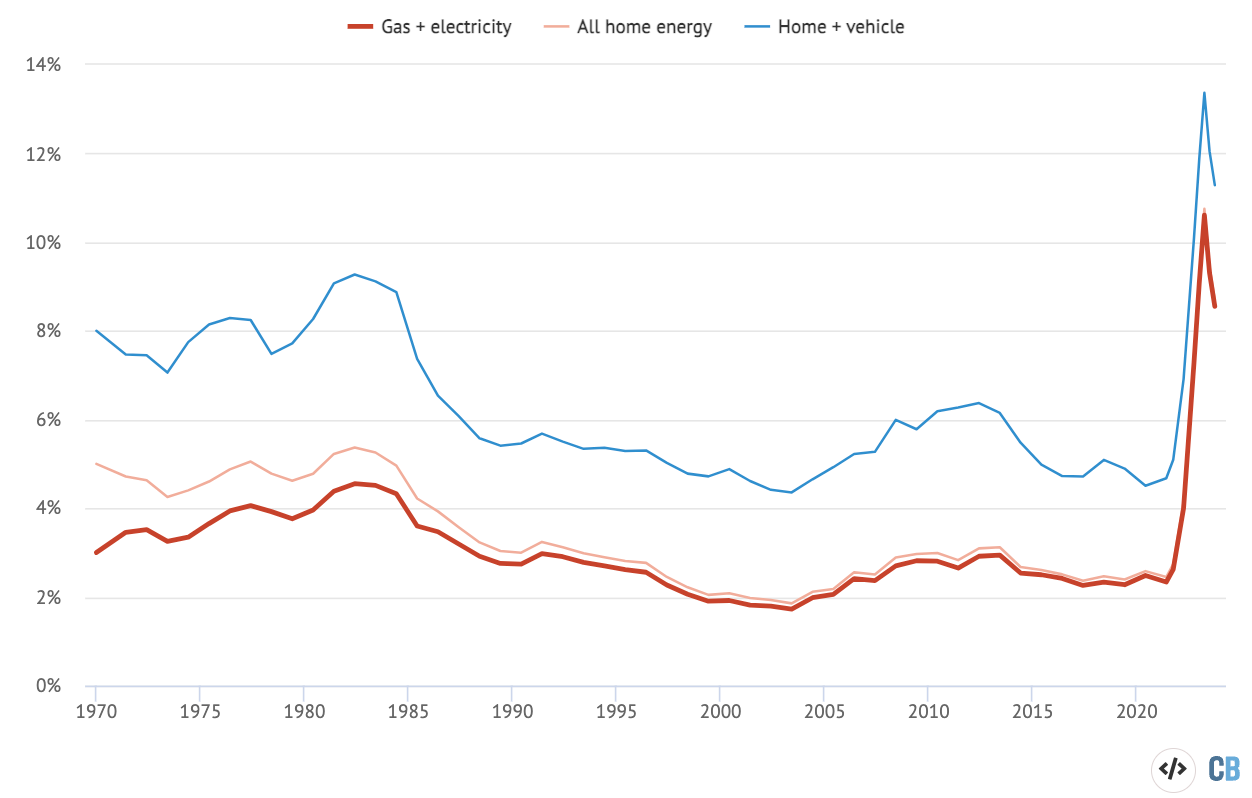 从能源成本占消费者总支出的比例来看,今年冬天英国家庭财务也将面临前所未有的压力,供暖和电力将达到家庭支出的11%,而汽车燃料的成本将再增加3%。到2023年初,平均英国家庭支出的13%用于能源和燃料,这一比例远远高于10年前,甚至超过20世纪70年代的石油危机时候。