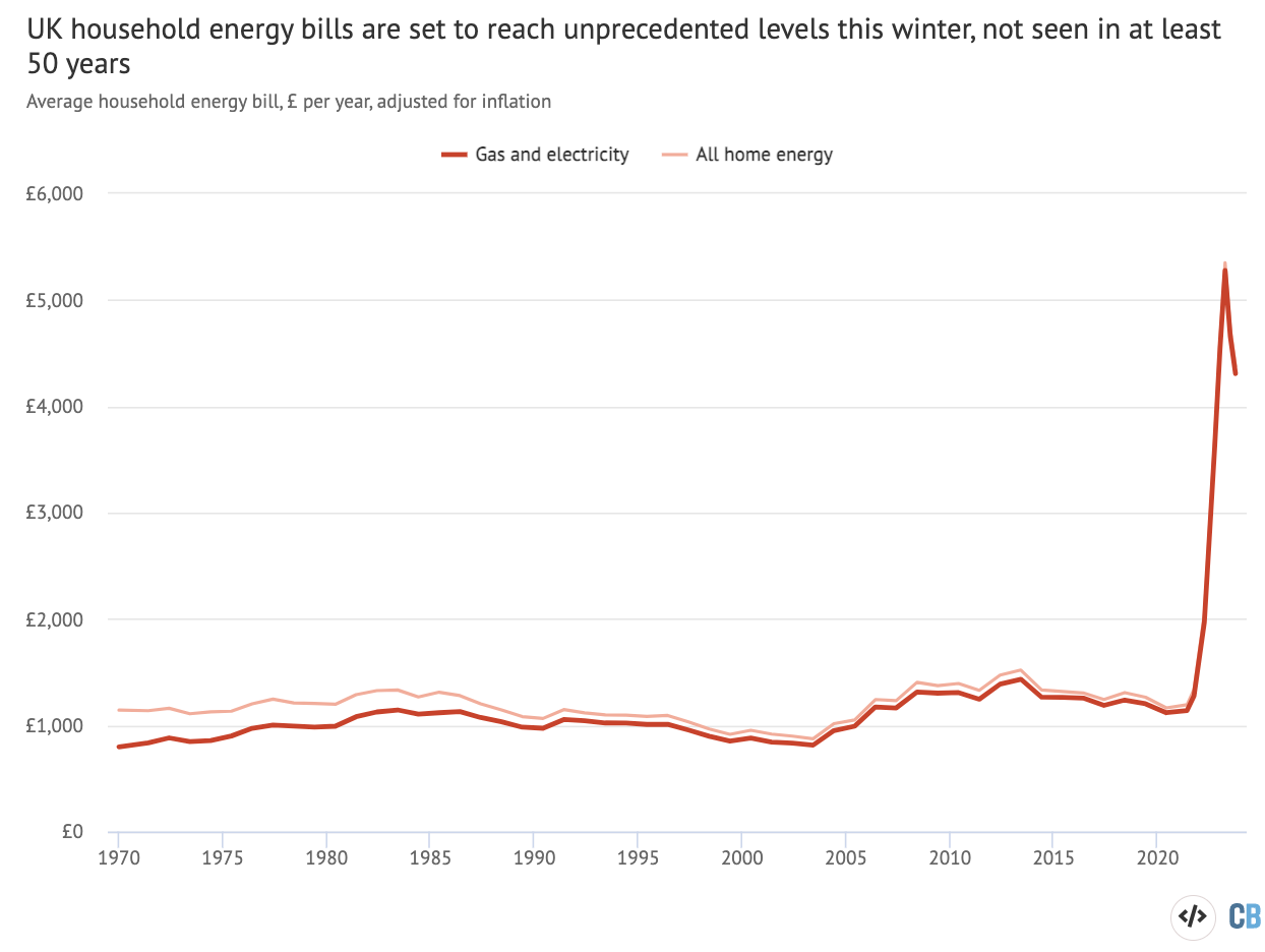 根据专业咨询公司的最新预测,10月份英国国内能源账单上限将从目前平均家庭每年1971英镑的水平增至3523英镑,增幅为79%。预计上限将在2023年1月1日再次增加,然后在4月1日进一步增加,最高可达5038英镑。这样,英国居民能源账单在短短18个月内增加了四倍多,普通家庭的燃气和电费,几乎是1970年的三倍。