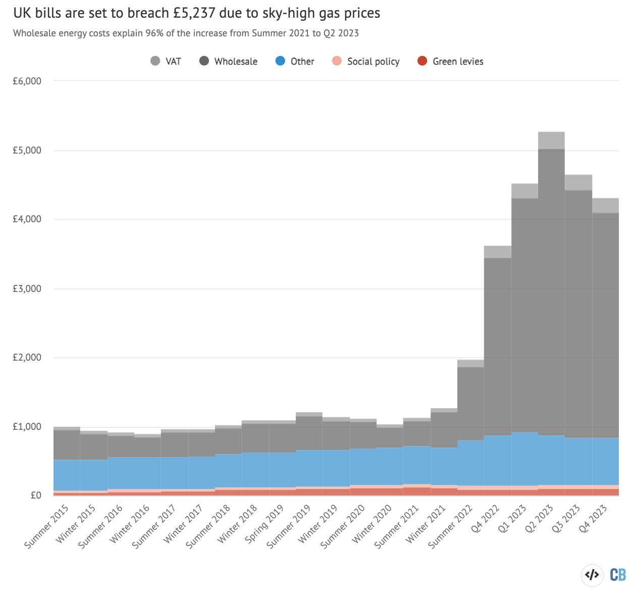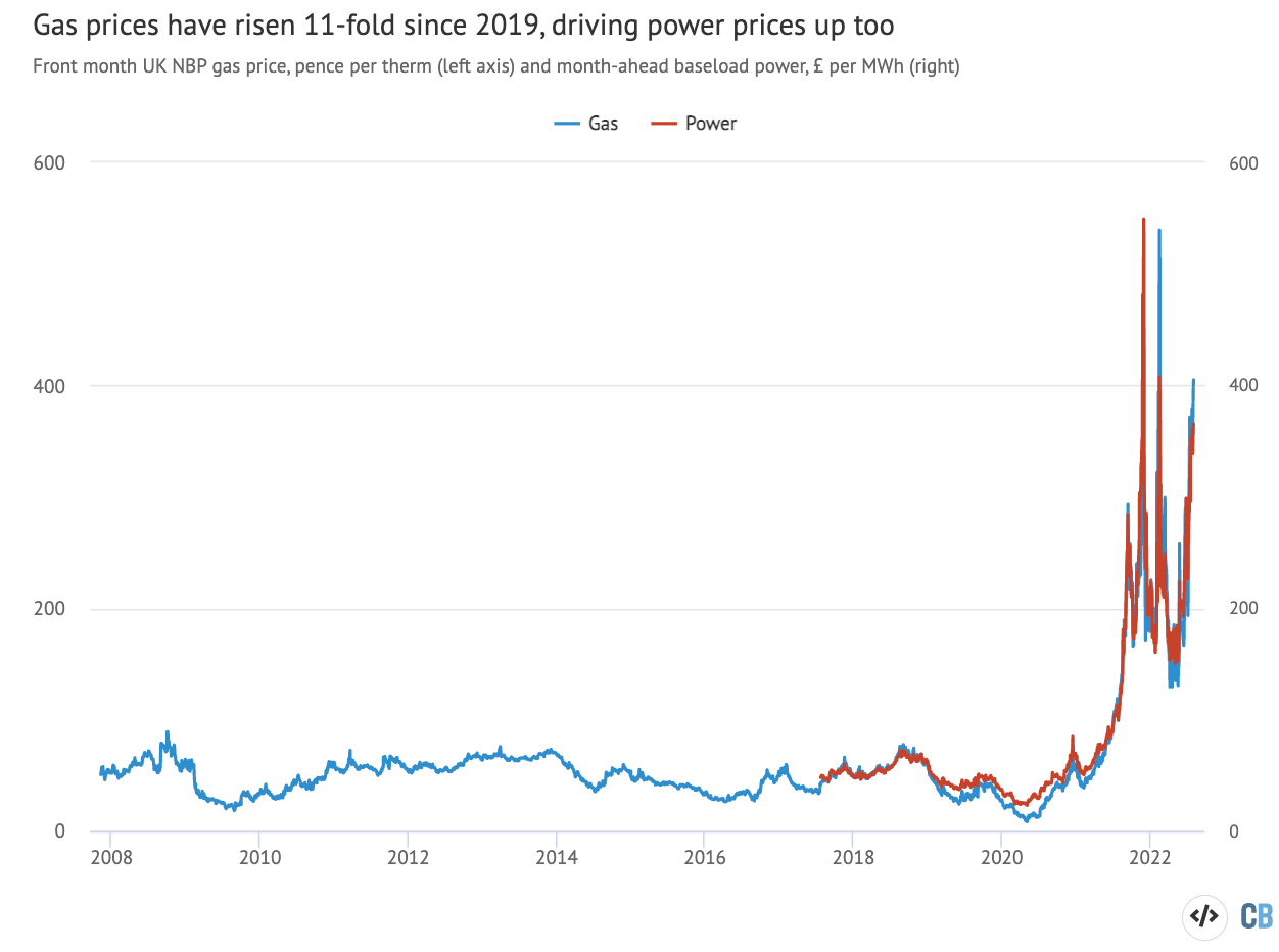 自2019年以来,天然气价格上涨了11倍,导致能源账单不断上涨。英国尤其容易受到天然气价格的影响,因为85%的英国家庭使用燃气锅炉供暖,全国40%的电力由燃气发电站发电(在法国和德国,只有不到50%的家庭使用燃气锅炉供暖)。