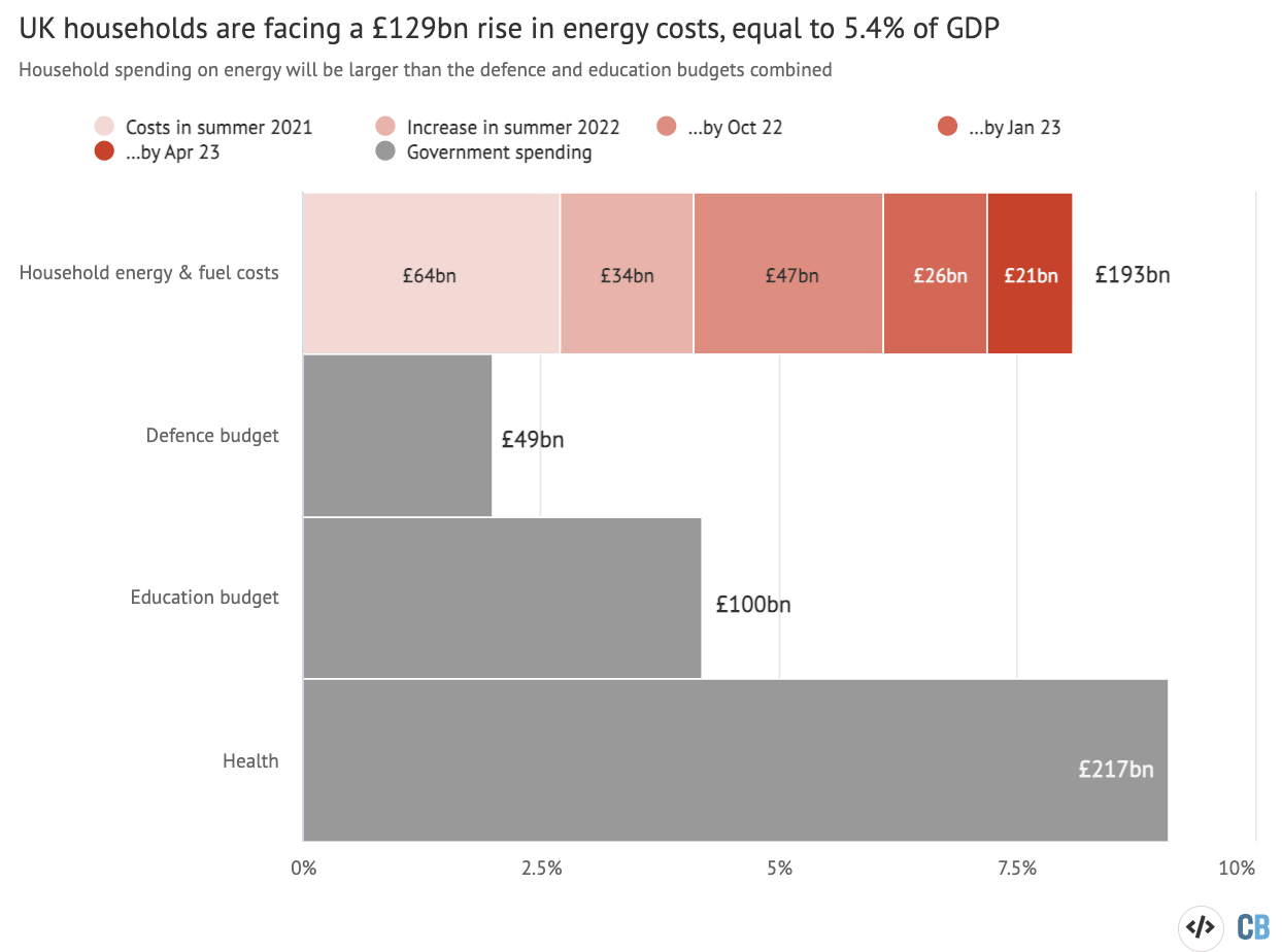 英国家庭能源账单已经达到了至少半个世纪以来的最高水平,平均每户将超过5000英镑。总体而言,英国家庭能源成本将达到每年1930亿英镑(占GDP 8.1%),这意味着家庭将面临的能源成本将超过英国政府教育支出(1000亿英镑)和国防预算(490亿英镑)的总和。