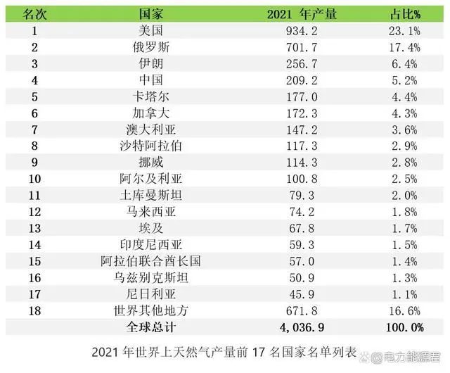今年2022年发布的2021年世界各国天然气的产量统计数据,仍为当前最新数据。下面的表格给出了2021年世界上天然气产量最多的17个国家,不均衡性相当明显。