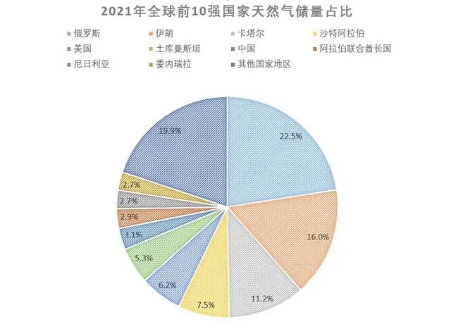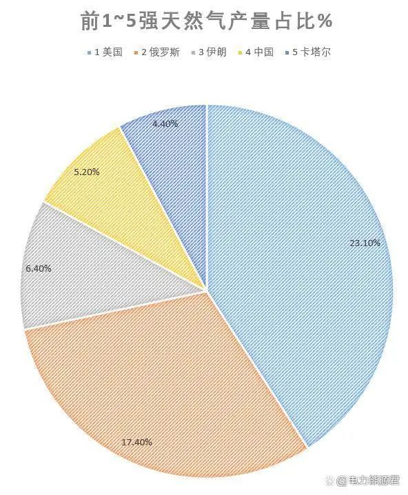 2、中国第四,占比约5.2%;再加上第三名伊朗占比约6.4%、第五名卡塔尔占比约4.4%,故前5名大天然气产国产量总占比为56.5%,超过了全球一半产量的份额,即前5名超过50%;