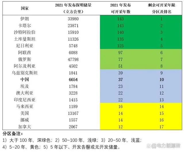 如果将其结合我国天然气储量来看,我们国家天然气的剩余可开采年数,在当前产气国17强中的排名和位置,则具体如下。