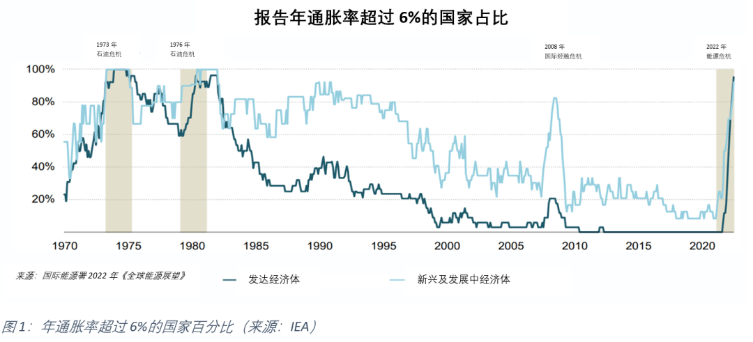 图 1 显示了自1970年以来报告的年通胀率超过6%的国家百分比。从图表中可以看出,无论是发展中国家还是发达国家,报告通货膨胀的国家比例于2022年接近100%,通胀如今已是影响大多数国家的全球现象。