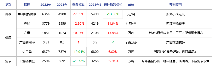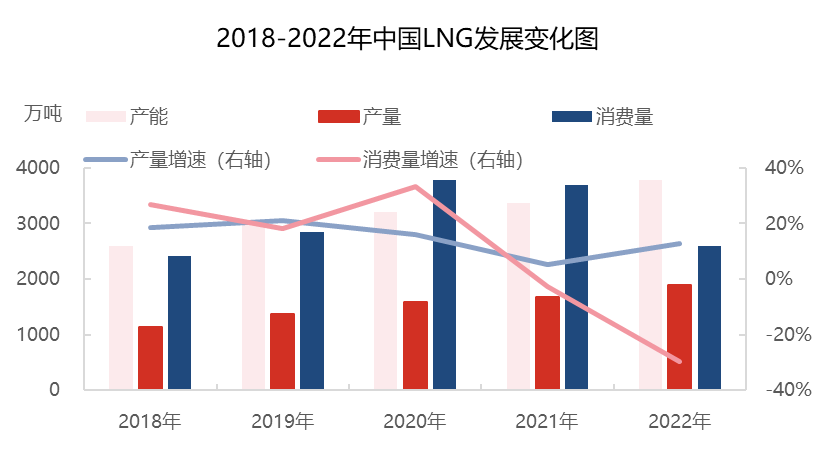 由2018-2022年国内LNG变化图中可以看出,2018-2019年国内LNG产能大于消费量,另外国家倡导“宜气则气、宜煤则煤”,“煤改气”政策导向宽松,LNG整体发展速度明显放缓。2020年受疫情影响,国际LNG低价资源大量进入国内市场,提高了国内终端使用LNG积极性,国产LNG消费量大幅增加。2021年在国际大宗商品大面积“通胀”以及国际LNG供应偏紧的局势下,国际LNG现货价格出现大幅上涨,导致国内用气成本升高,LNG终端多转向使用管道气,LNG消费量在近十年来首次出现下滑。2022年俄乌冲突使国际局势更加紧张,进口LNG资源明显减少,国内 LNG价格高企,下游LNG消费量明显减少。