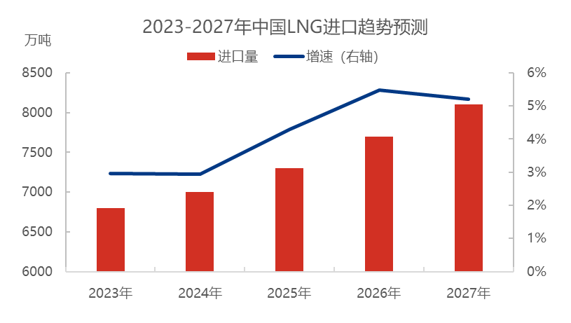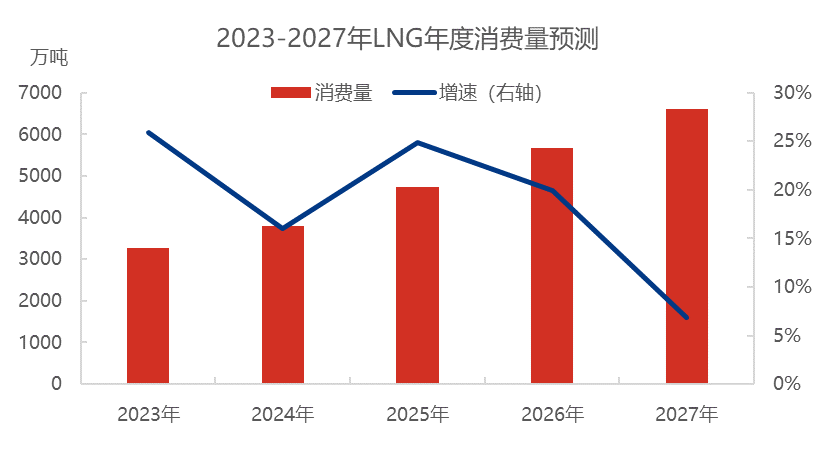 吸取了2022年欧洲能源危机的教训,中国在未来几年内将会更加注重国内的能源安全问题,以中石油为首的国产工厂的供应能力将会得到很大的提升。同时在“碳达峰”目标加持下,国内天然气进口量继续增加,2023-2027年LNG进口量逐年增加。其中中俄天然气合作逐渐加深,管道气进口量增加,进口LNG量虽逐步增加,但2023-2024年受俄乌冲突余温影响,增速不大。2025年随着国内多地LNG接收站基础设施继续完善,LNG进口量增速小幅提高。2025年后中俄东线全线贯通管道天然气进口增多,国际LNG价格恢复至合理水平,LNG进口量增速小幅提高,并且由于国内天然气资源增加,进口LNG气化进管输量逐年下降,以LNG槽批形式供应国内市场增多。并且进口LNG与国产LNG开始打价格战,再次刺激国内LNG下游发展需求。
