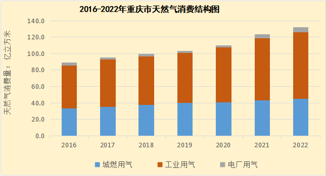 重庆市天然气消费量持续稳定增长,一方面得益于重庆市位于四川盆地,天然气资源丰富,在天然气利用方面有天然的优势,天然气消费量在一次能源消费中占比远高于国内平均水平;另一方面,重庆市天然气消费结构相对合理,工业用气量则超过了60%。从近七年重庆市天然气的消费数据来看,重庆市天然气消费总量呈逐年增长态势,其中工业用气由2016年的51.2亿立方米增长到2022年的81.2亿立方米。