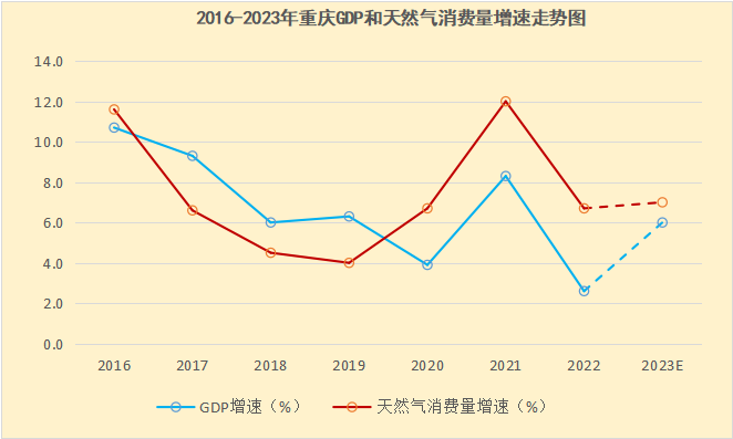重庆市政府工作报告指出,2023年重庆市经济发展的预期目标是地区生产总值增长6%以上。从重庆市近七年的历史数据来看,天然气消费量的增速和GDP增速具有一定的关联性。对于重庆市而言,2023年天然气消费将会随着经济的增长而持续增长,消费量预计会突破140亿立方米!