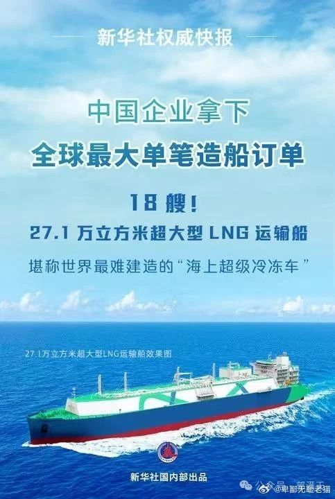这一“全球最大订单”将由中国船舶集团旗下沪东中华承接,这18艘LNG运输船是全球最大的LNG运输船,较常规17.4万立方米LNG运输船运载能力提升57%。