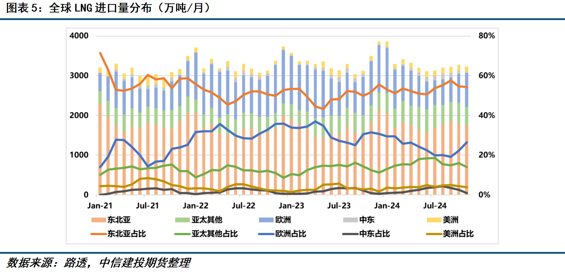 LNG方面,在历经2023-24两年投产空窗期后,2025-27年全球LNG将进入产能投放周期,三年产能预计增长41%,2025年产量预计增长9%。东亚、欧洲等主要进口区域需求稍显疲态,南亚、东南亚等地区主导LNG需求增长的情况下,全球LNG供需将不可避免地向宽松方向移动,2021年以来LNG供需持续紧张的局面面临终结。
