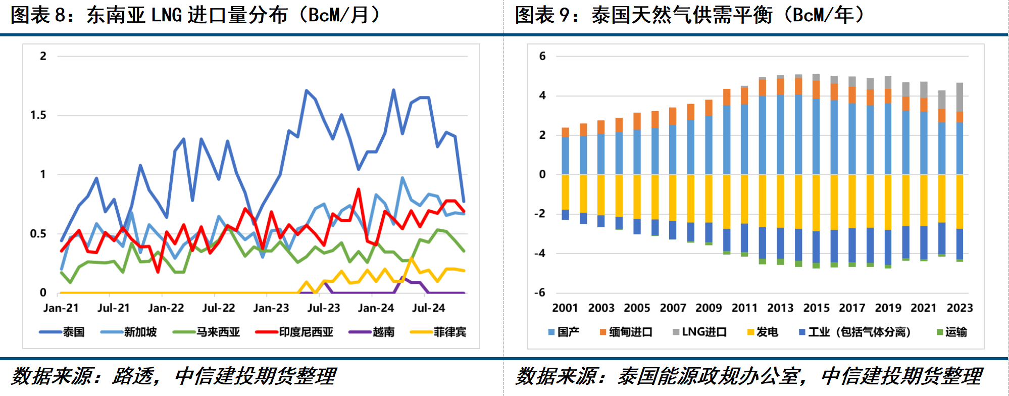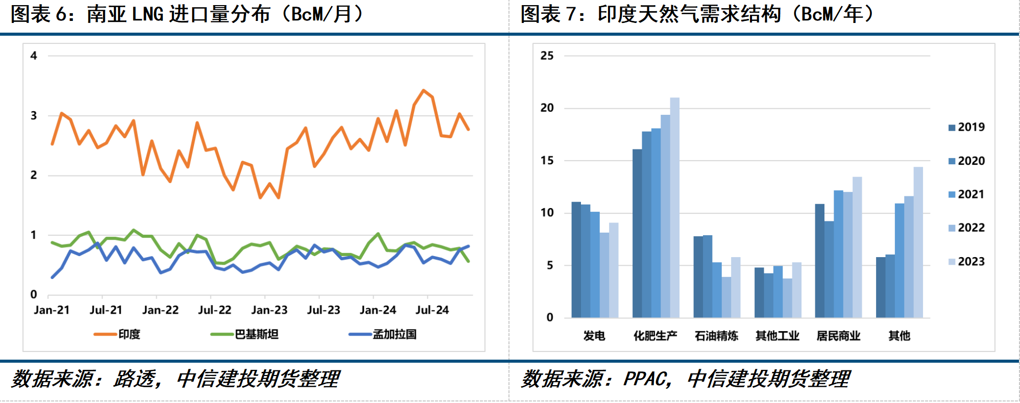 低价将刺激南亚进口高增。2024年1-11月,南亚LNG进口同比增长16%,其中印度LNG进口同比增长22%,上半年进口增速更是高达32%,有效对冲了欧洲的需求下滑。南亚三国中巴基斯坦与孟加拉国状况相似,历史上天然气资源丰富,国民经济特别是电力部门对天然气的依赖度较高,不过由于近年来国内天然气产量下滑,被迫依赖LNG进口弥补缺口。虽然供给缺口刚性放大,但两国经济发展与国际收支状况不佳,LNG价格高企成为限制进口增长的主要因素。我们预计随着LNG产能投放导致的价格下行,两国进口量将恢复双位数以上的增长。印度近年经济发展迅猛,对各类大宗商品的需求水涨船高。印度半数天然气依赖进口,化肥生产是消耗天然气的主要部门,随着2021-2024年的投产周期告一段落,未来几年印度化肥生产对天然气的需求将趋于稳定。我们预计随着LNG价格从过去三年的高位回落,印度发电、居民商业等需求快速修复后将转入稳步的高速增长时期。