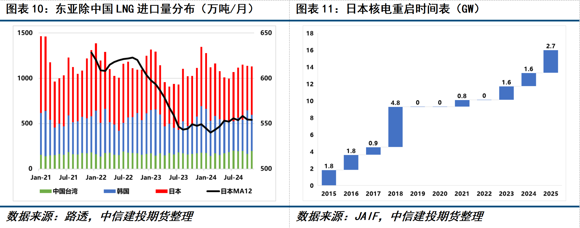 核电重启将导致日本LNG进口继续减量。东亚除中国大陆外,中国台湾与韩国近年LNG进口持稳。日本LNG进口量在2023年趋势下行,由原本的600余万吨/月下降至550余万吨/月。日本LNG进口曾在2011-2014年间快速增长,主要由于东日本大地震后日本选择关停核电,转而依赖LNG弥补电力缺口。随着核电重启与新能源发电量的增加,日本LNG进口从2015年持续减量至今。截至2023年,日本共重启反应堆12座,总功率11.GW。2024年底,女川2号、岛根2号反应堆重启,总功率1.6GW。2025年,柏崎刈羽6、7号反应堆预计重启,总功率2.7GW。我们估算这四座反应堆的重启将使日本2025年LNG进口量下降约350万吨(30万吨/月),考虑到新能源发电量的增加,这一幅度还将更大。