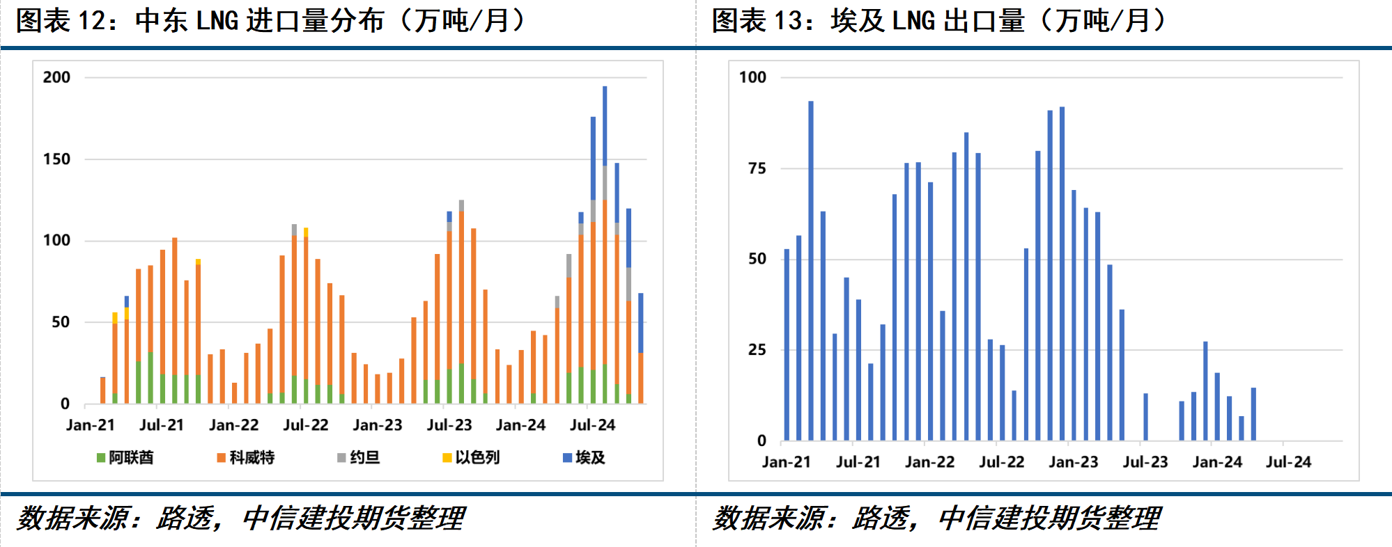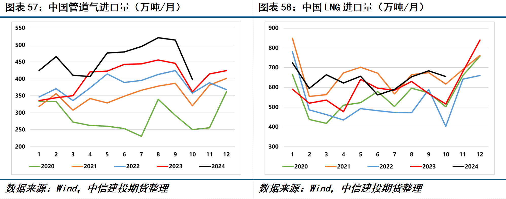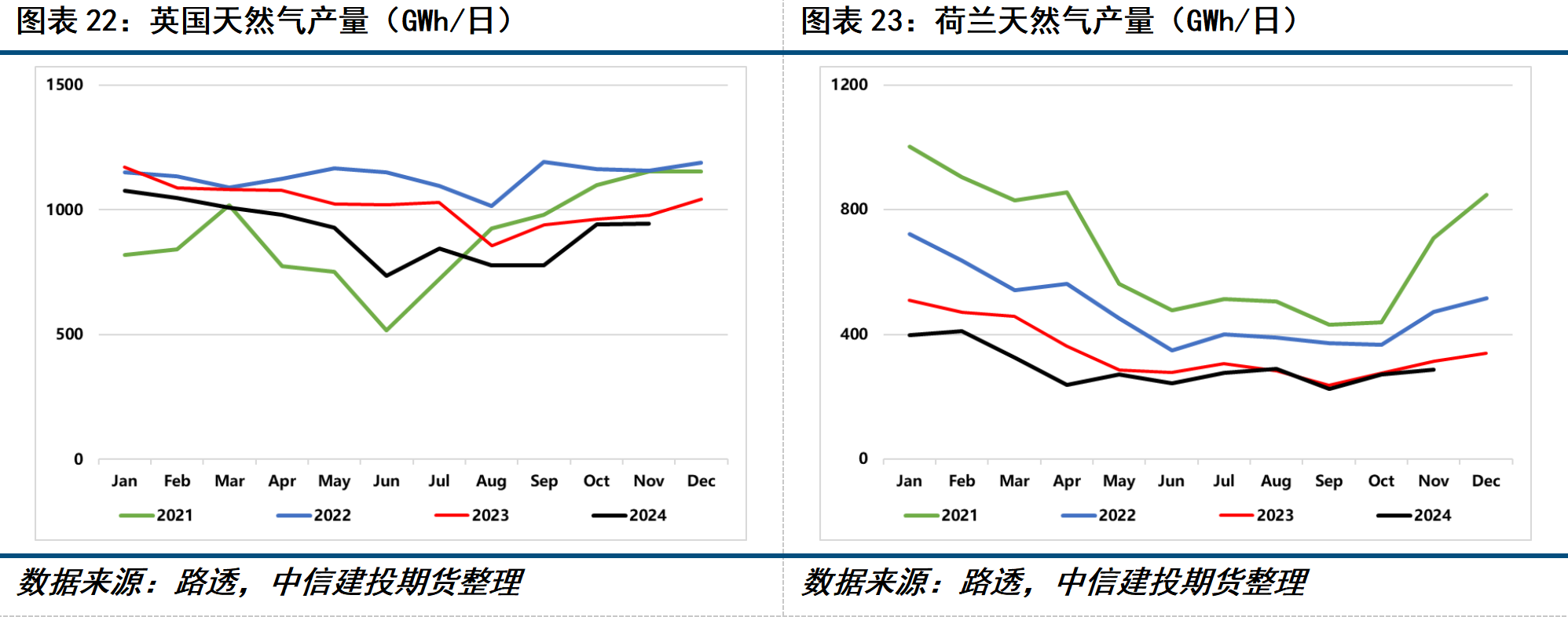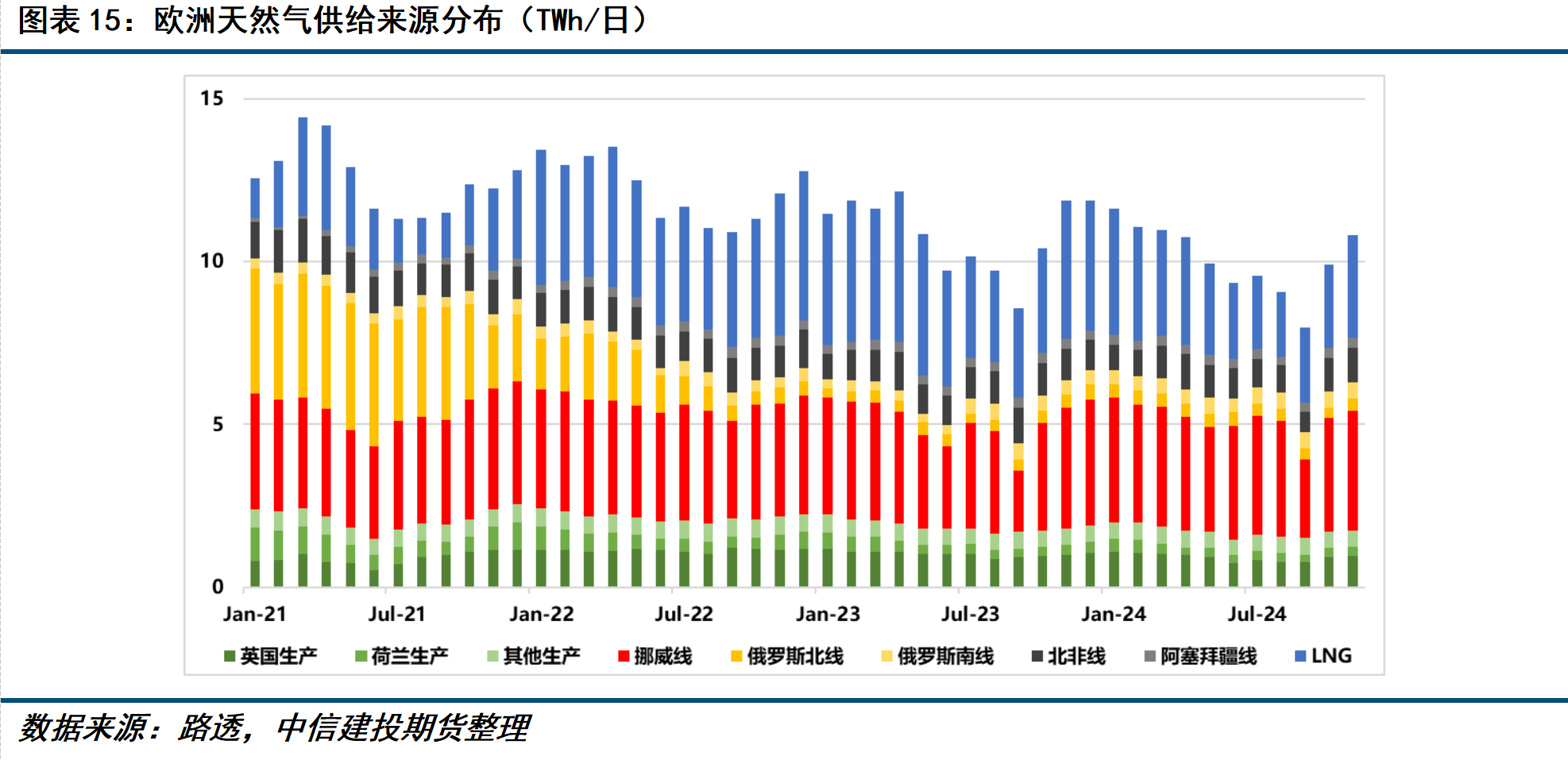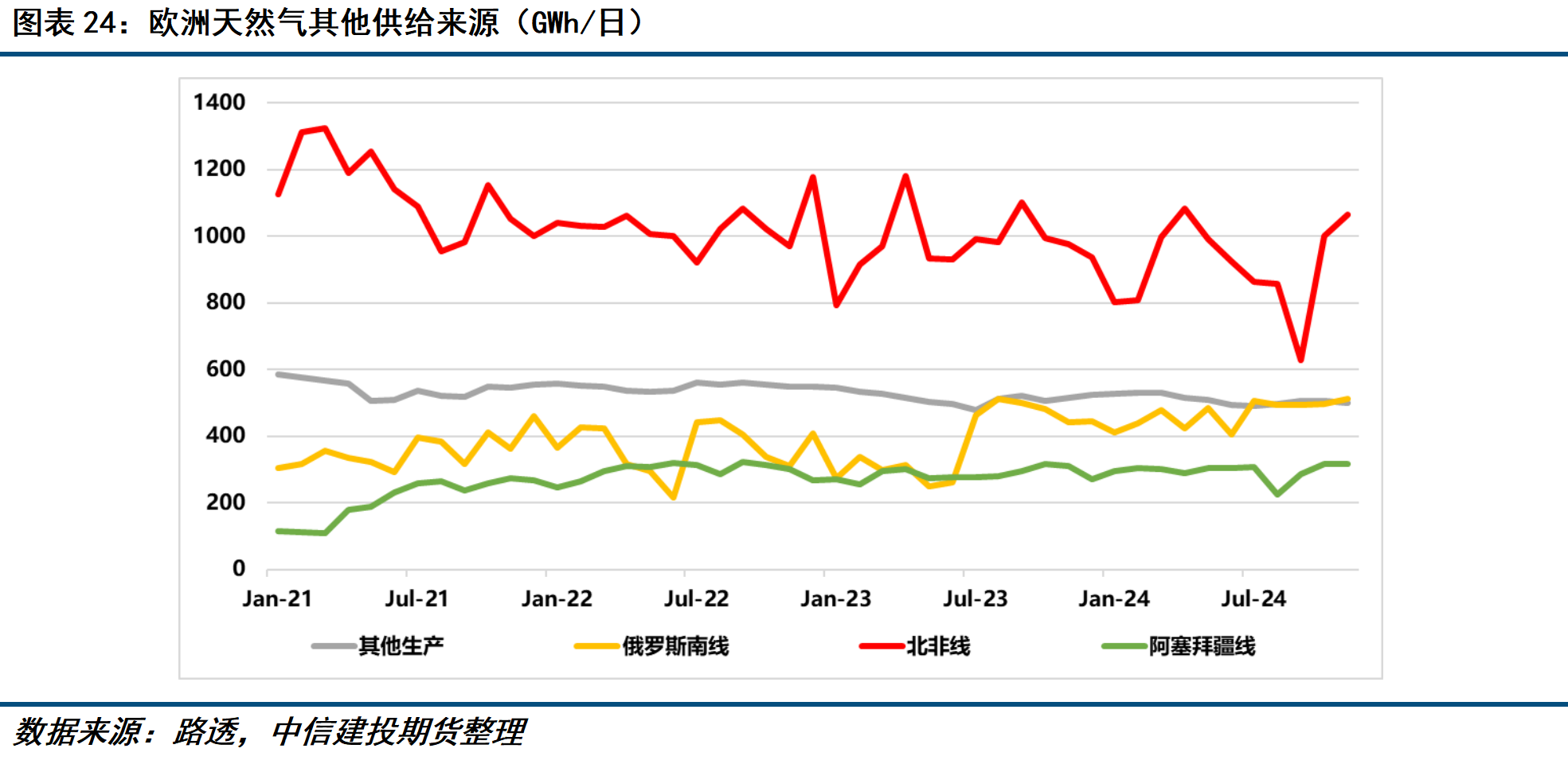 其他供给来源将继续以稳为主。对于欧洲其他的天然气供给来源,我们基本沿用半年报中的观点。英国方面,北海气田缺乏投资的状况没有改观,现有气田的衰减预计使得天然气产量进一步下行。荷兰方面,2024年4月格罗宁根气田完全关闭后,其余气田的生产状况稳定,产量预计持稳。俄罗斯南线、阿塞拜疆线方面,供应协议稳定且均已达到设计容量,进口量预计持稳。北非线方面,除少部分从利比亚到意大利外,主要是从阿尔及利亚分别经Transmed和MEDGAZ到意大利和西班牙,2024年9月两条管道均进行检修导致减量较多。考虑到阿尔及利亚近年天然气产量持续增长,且9月LNG出口量环比大增,我们认为减量的主要原因确实是管道检修而非夏季用气高峰导致的气量不足,2025年北非线进口量有望恢复至近年正常水平。