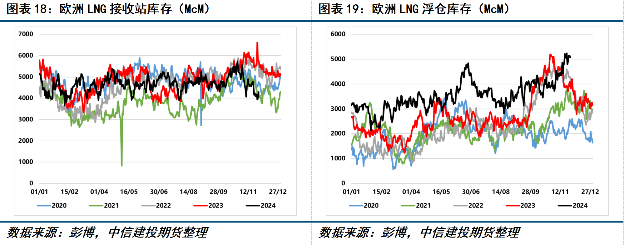 供需宽松叠加库存低位,欧洲LNG进口增速或转正。2024年欧洲天然气供给端最大的减量来自LNG,1-11月欧洲LNG平均进口量由1034万吨/月下降至801万吨/月,接收站平均输气量由3851GWh/日下降至2981GWh/日,下降幅度达23%,其中4-5月需求淡季减量幅度超30%。欧洲LNG进口减量的原因是多方面的:欧洲天然气市场在2024年前三季度始终保持需求同期最低、库存同期最高的基本面格局,在政府与市场参与者无意进一步推升库存水位的情况下,LNG作为成本最高的边际供给被首先挤出。第四季度欧洲天然气需求向近年正常水平回归、库存拐点提前,但LNG进口仍未修复,主要原因有两点:一是9-10月份东亚为应对可能的冷冬提前备货挤压了欧洲采买。二是市场参与者对暖冬叠加LNG产能释放下的价格前景并不乐观,高价买货意愿较低,接收站库存不断消耗与浮仓库存持续累积所形成的对比可作为这一判断的证据。在2025年全球LNG供需转宽松、取暖季结束后欧洲库存中低位的基本面假设下,我们预计欧洲LNG进口增速或小幅转正,以保证冬季来临前将欧洲天然气库存恢复至近年高位水平。