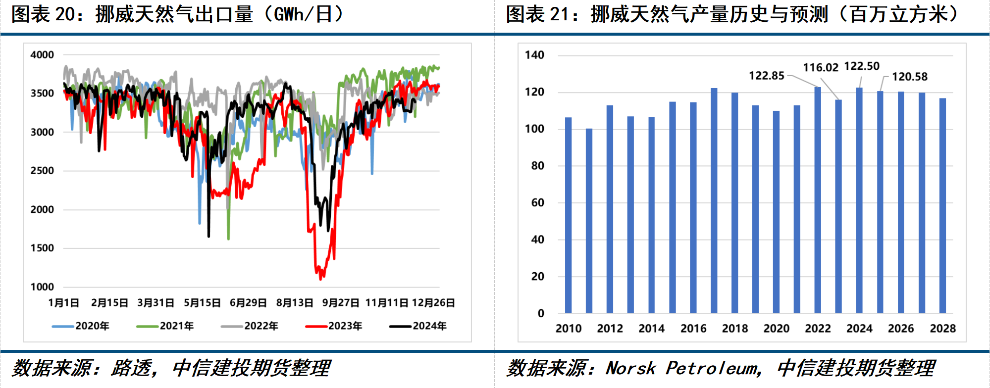 2025年欧洲天然气供给冲击强度将进一步下降。我们对欧洲天然气供给端的讨论从两个方面出发,一是供给量的变化,二是供给冲击的强度。供给量方面,今年最显著的变化是LNG进口大幅下滑,最主要的关切则是输气量约400GWh/d、占欧洲总供给约4%的俄罗斯北线(从俄罗斯经乌克兰到中欧)将于年底断供。在2025年全球LNG市场供需转宽松的假设下,我们对欧洲天然气各供给来源进行了推演,预计其中占主导的LNG(2024年占比28%)、挪威线(2024年占比34%)均有增量,俄罗斯北线的断供不足以形成严重的供需缺口。供给冲击方面,2024年的强度较2023年大幅减弱,没有发生挪威持续超量检修、澳大利亚LNG码头罢工等重大供给冲击事件,类似事件规模均较小。新增的供给冲击仍主要围绕俄罗斯北线:5月Gazprom与OMV(奥地利石油天然气集团)的法律纠纷发酵、8月乌克兰军队攻入俄罗斯本土占领天然气计量站、11月Gazprom与OMV的纠纷裁决均导致欧洲天然气价格大幅上涨,正是这些围绕俄罗斯北线的供给冲击贡献了全年大部分的价格涨幅。不过随着2025年俄罗斯北线的完全断供,剩余管道都具有相当的稳定性,供给冲击的强度大概率将进一步下降。