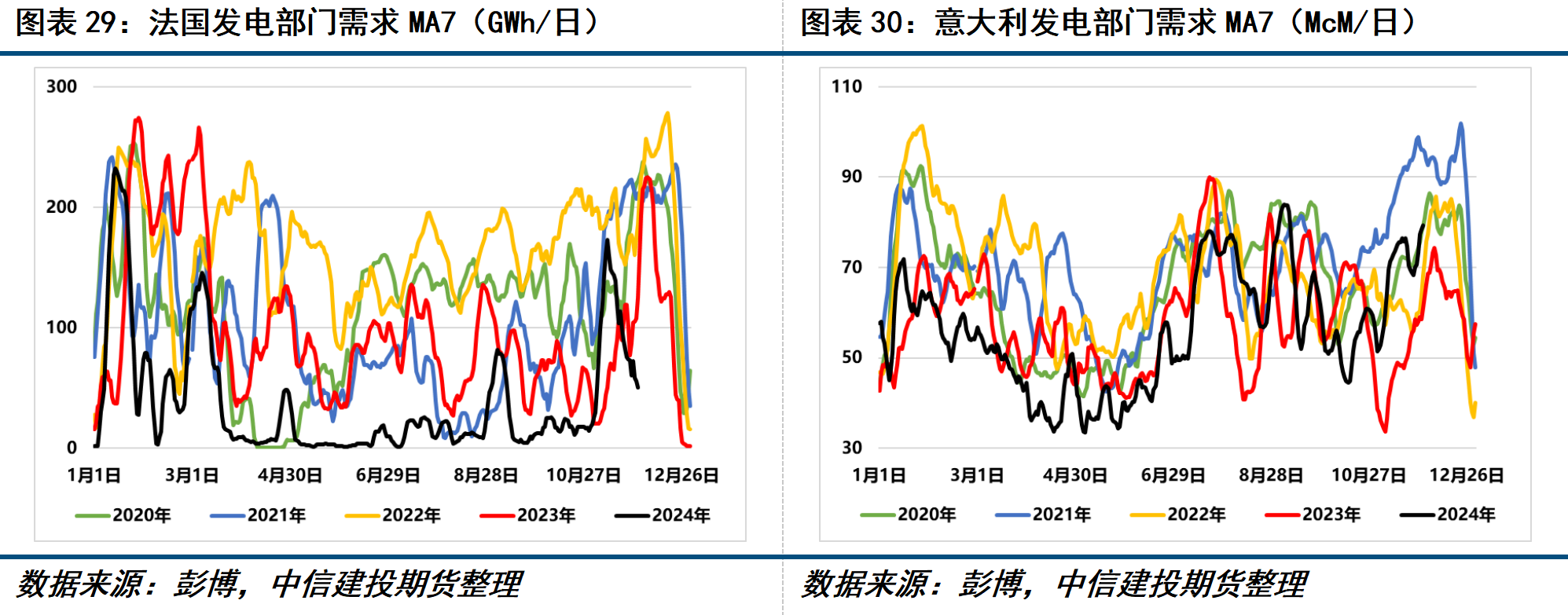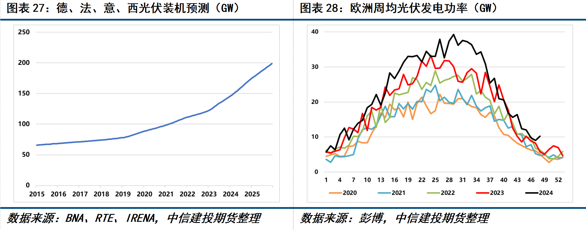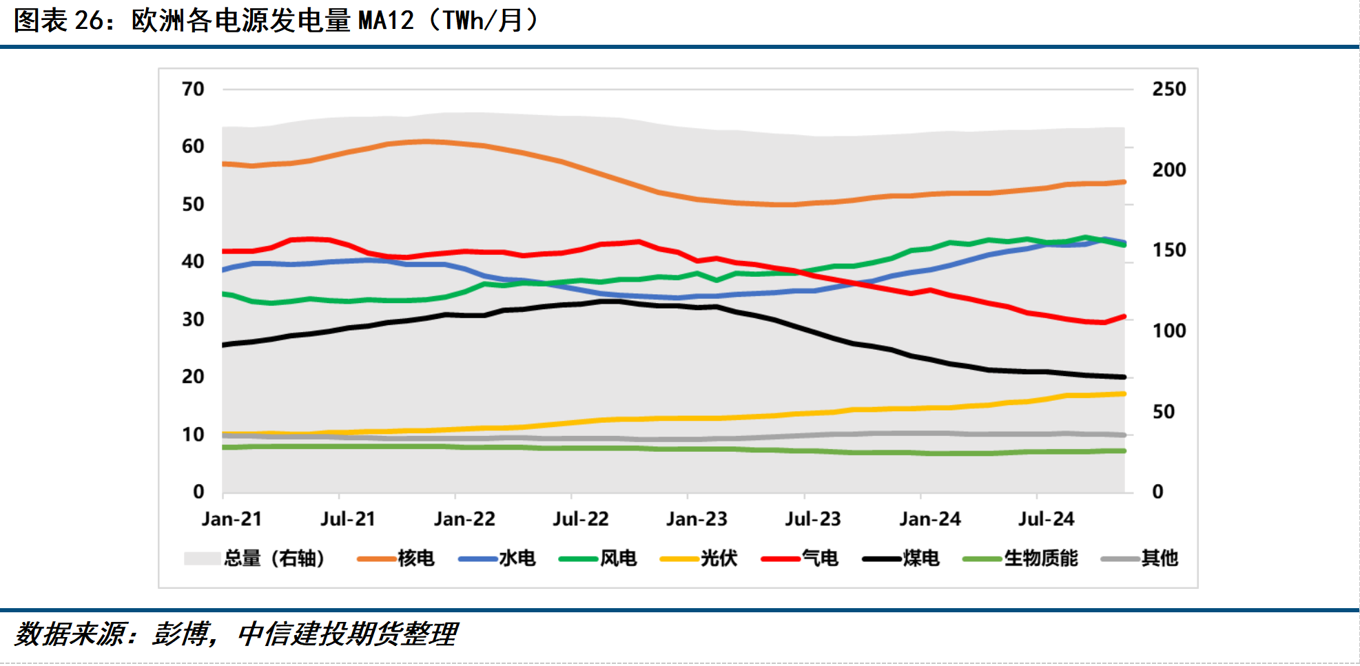 欧洲电力部门天然气需求前景暗淡。我们在此前的专题报告与半年报中均强调:由于可再生能源特别是光伏发电持续高增、核电机组退役进程中止、气候因素导致水电出力改善三大因素的共同挤压,欧洲天然气、煤炭发电量自2022年中开始持续下行。其中最为关键的是第一点:欧洲已经于2024年上半年迈过可再生能源取代化石能源成为主要电力来源的历史性拐点,而这一进程并未有减速迹象。综合BNA、RTE、IRENA等机构预测,欧洲光伏装机与发电量将在2025年继续高速增长,增速或保持15%以上。以气电下降最多的法国和下降最少的意大利为例,均可观察到2024年光伏发电大增直接对应气电大降,在当前光伏发电基数已超过气电一半的情况下,预计2025年气电受到的挤出效应将更为显著。