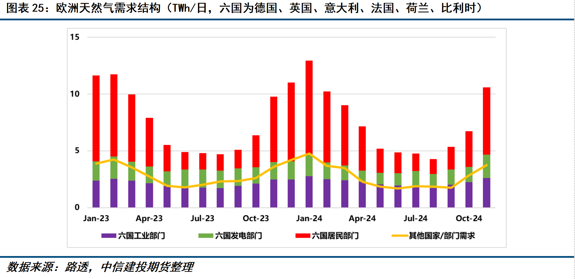 欧洲天然气需求不做乐观看待。按地区划分,欧洲天然气需求集中于德国、英国、意大利、法国等经济大国,按部门划分则分布于工业、发电和居民部门,分别占比约29%、18%、53%。欧洲纬度较高、经济发展较早,居民生活高度依赖天然气采暖,因此居民部门是需求侧的主导,且几乎仅与气温相关。欧洲已连续三年暖冬,不过鉴于远期天气的巨大不确定性,我们在此仅做出经验性的讨论,具体的天气情况有赖于更近周期的跟踪。需求端最显著的趋势是天然气发电量的大幅下滑,2024年降幅高达13%,我们认为这一趋势还将持续。工业部门需求2024年以来未有起色,同样面临进一步的下滑风险。一句话概括,欧洲天然气需求侧的确定性均为利空、可能性存在利好,整体仍不做乐观看待。