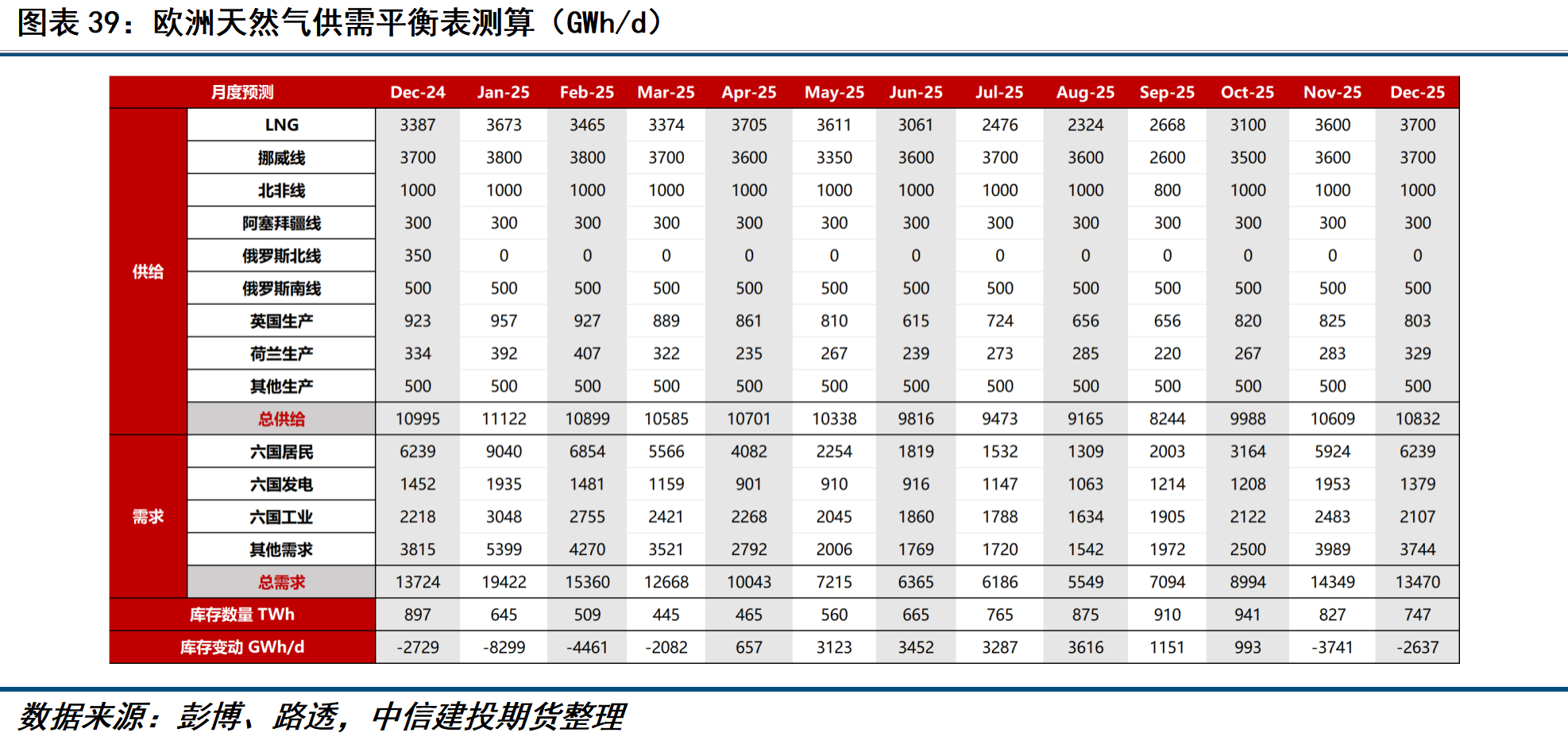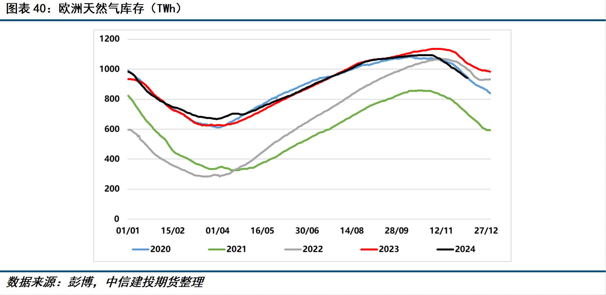 如果说2024年欧洲需求在新能源冲击下的疲弱略超预期,那么2025年欧洲需求将继续弱势已成为市场共识,主要的不确定性在于2025-26年冬季的天气情况。弱需求格局下、表面的供给冲击背后,导致2024年TTF价格持续上行的根本动力,是欧洲以外需求快速恢复导致的全球LNG供需超预期紧张。但正如我们在第一章中判断,随着LNG大投产周期的开始,2025年将成为全球LNG供需开始宽松化的转折之年。综合来看,2025年欧洲天然气市场供需两端驱动向下,不过好在开局并不算糟,LNG进口偏弱与经乌俄气断供将使得2024-25年冬季于近年来首次迎来较大幅度的去库,冬季结束后库存水平或来到450-500TWh的近年绝对偏低位置,从而支撑TTF价格不至于如2023、2024年初一样在取暖季中段就开始大幅下跌。