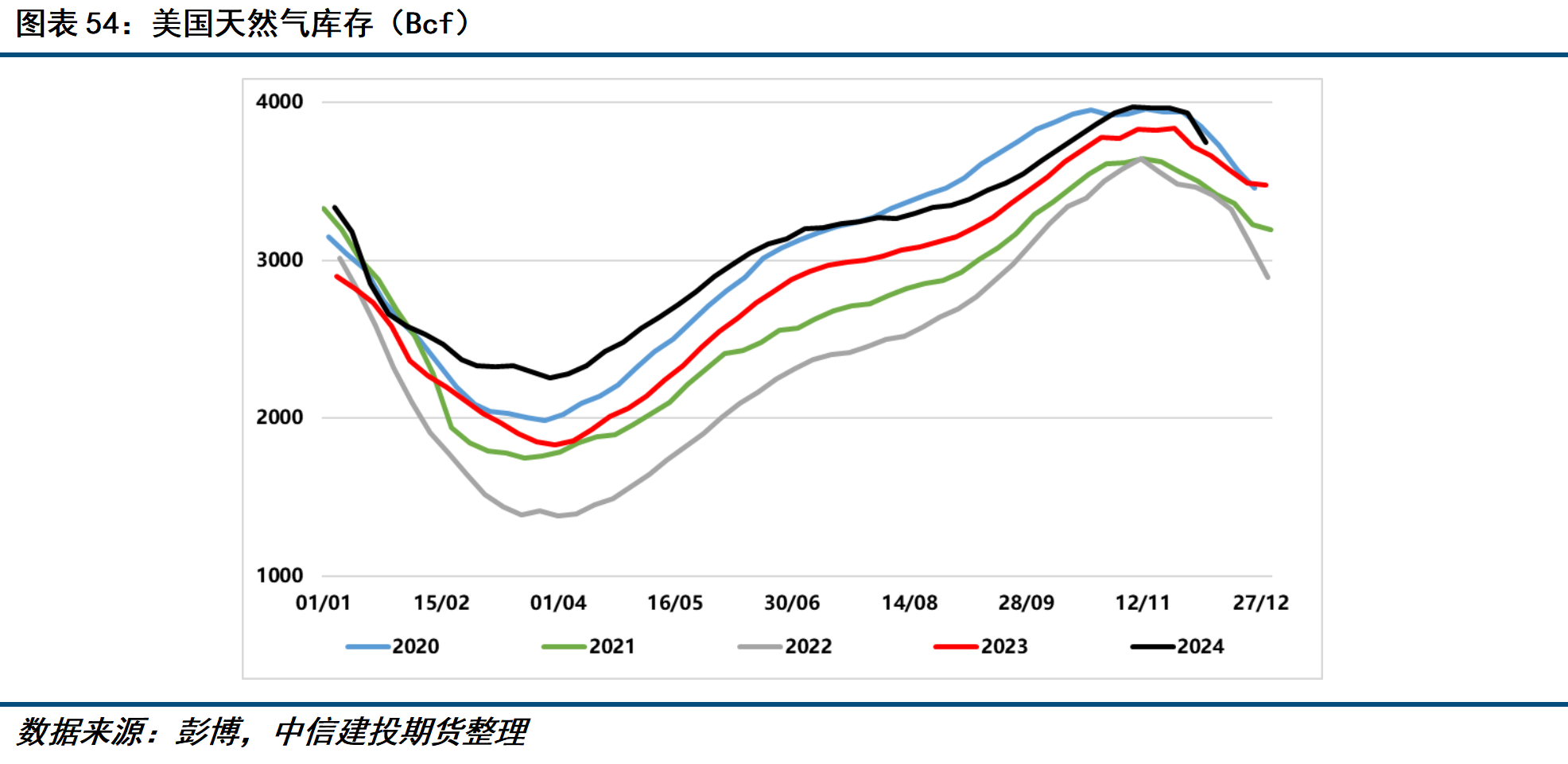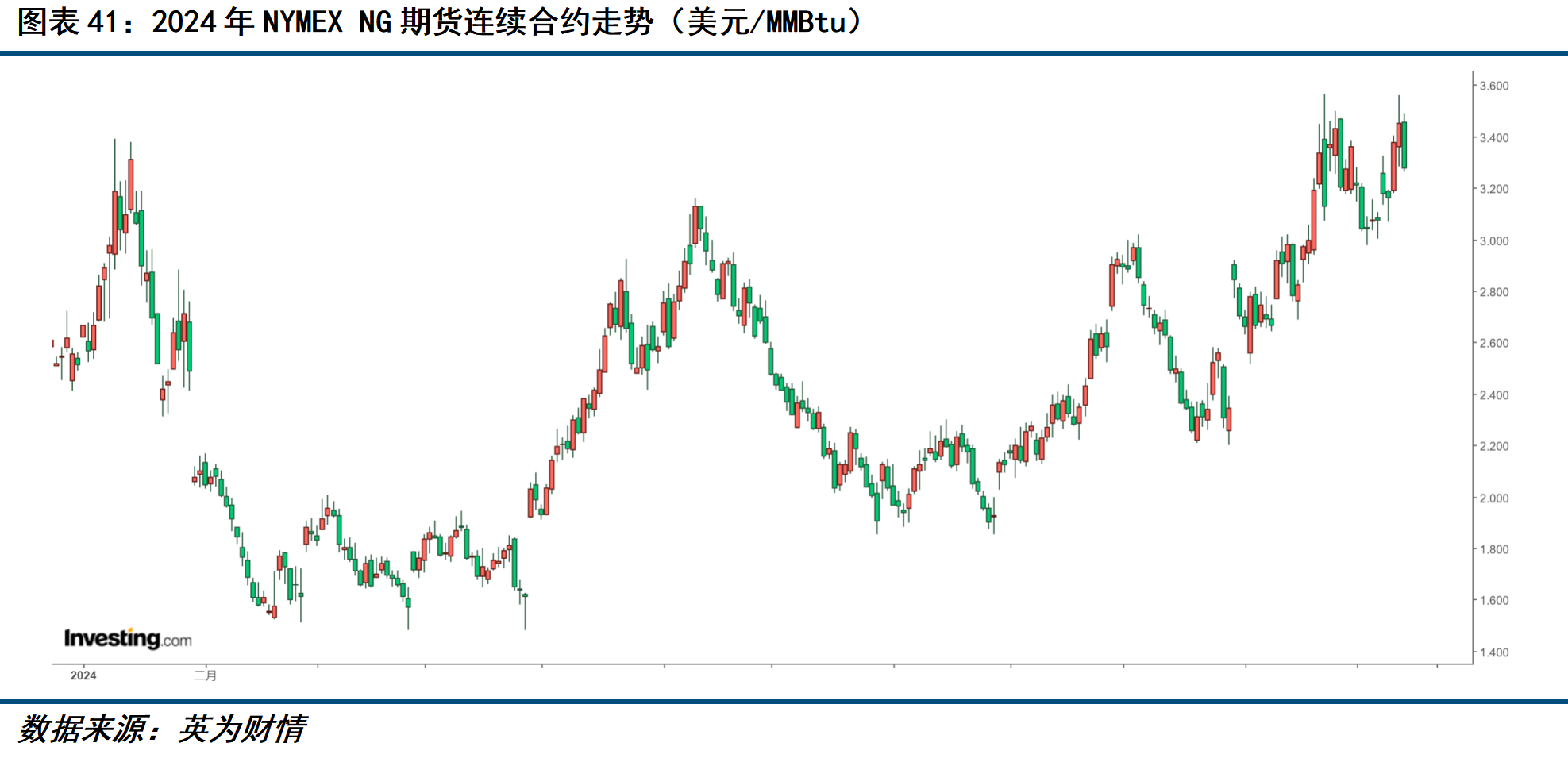 复盘2024年HH行情:2024年1月:寒潮季节性袭击美国,不仅导致需求猛增,而且部分地区的天然气生产也受到影响,阶段性供需错配下全国各地现货价格飙升,带动期货盘面上行。不过短期冲击无法改变供需宽松、库存高位的基本面格局,HH冲高后快速下行。2月-4月:取暖季最后一个月份3月合约成为首行,需求端难有潜在利好支撑,高库存压力继续推动价格下行,盘面连续三次考验1.5美元/MMBtu整数关口支撑。2-3月间EQT与Chesapeake等头部生产商纷纷宣布减产计划,3月美国天然气产量显著下降,供需边际转紧,但高库存压力持续。5月-6月:夏季发电旺季第一个月份6月合约成为首行,市场迎来潜在利多。在美联储释放宽松预期、中美制造业PMI共振回升环境下,全球市场宏观情绪显著转强,各类大宗商品价格迎来普遍上涨,在铜价大涨的过程中,市场开始流行数据中心导致电力需求高增叙事,天然气成为与铜相提并论的核心标的,推动天然气持续上行。上涨过程中,市场将夏季高温导致发电需求高增、库存压力改善的利多一并计价,推动HH上破3美元大关。6月-8月:随着大宗商品价格的普遍回落,基本面改善幅度有限的HH被市场买预期卖现实,再度走出尖顶下跌,由于本轮下跌时供需过剩与库存压力均有所缓解,HH底部区间在2.2美元美国主流生产商成本附近形成。9月-10月:持续低价环境中减产预期再度发酵,飓风扰动导致产量下降后市场抢跑减产交易,减产预期证伪后价格迅速回落。11月-12月:首行来到取暖季,市场氛围转多。随着天气预报显示美国将在11月遭遇超季节性寒潮的信息愈发确定,HH走出一轮上行趋势,寒潮结束后HH在LNG码头投产预期等利多支撑下保持高位震荡。