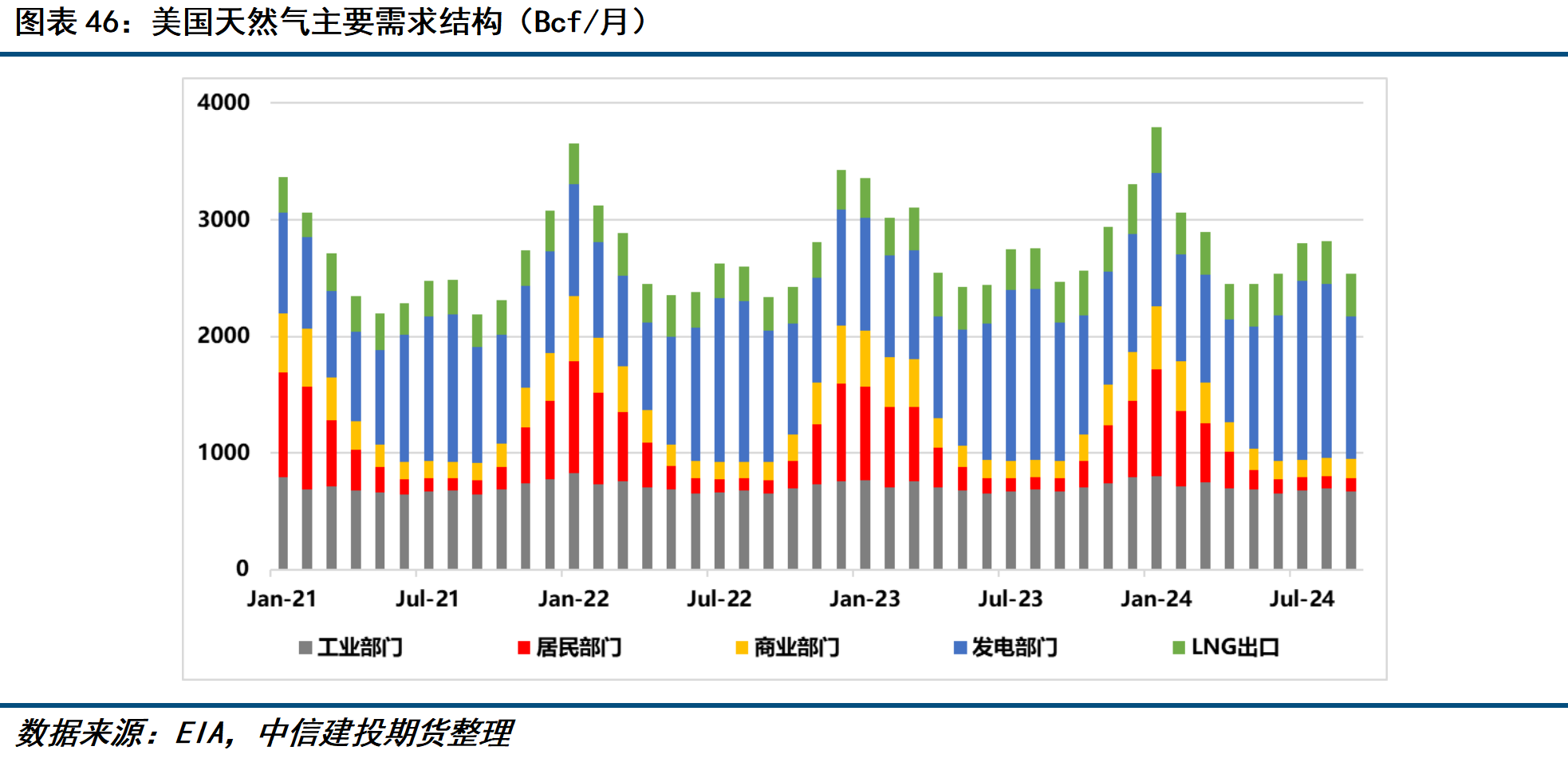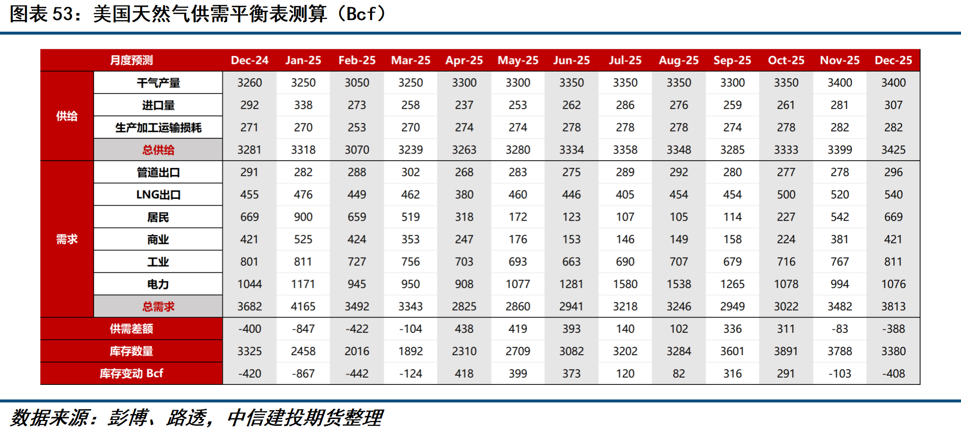 美国天然气需求将确定性强劲增长。由于纬度、电力结构以及资源禀赋等方面的差异,美国天然气需求并不集中于冬季采暖而是更加均衡。若不考虑管道气进出口、生产加工运输损耗等次要项,目前工业部门、居民商业部门、发电部门、LNG出口需求分别占比25%、26%、39%、13%。其中工业部门需求相对恒定。居民商业部门需求主要用于采暖,近三年来整体处于偏低水平。我们已在2.3节中对全球气温趋势进行了探讨,不过需要注意的是相较欧洲而言,美国寒潮强度更高,除影响需求外还会可能对天然气生产造成影响,易使价格在短时间内大幅波动。发电部门需求占比最大且集中于夏季,在多重利好驱动下,2024年同比增长5%,我们认为2025年这部分将继续较快增长,扮演增量压舱石的角色。2025年最大的边际变化来自LNG出口,历经近三年空窗期后,Plaquemines P1和Corpus Christi S3的投产预计使得LNG出口量增长25%。与欧洲的惨淡形成鲜明对比,美国天然气需求将在2025年确定性地迎来更强劲的增长。