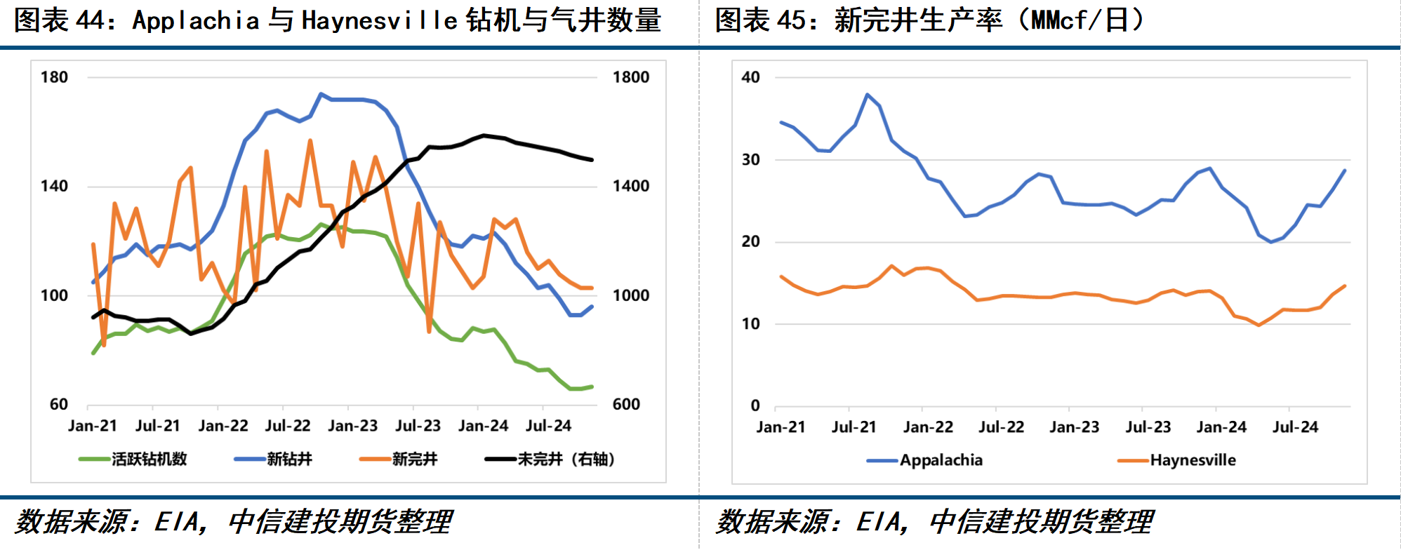 未完井表征的产量弹性仍然较高。观察Applachia与Haynesville两大天然气主产区的钻机与气井数量,自2023年初天然气价格从高位大幅回落以来,新钻井数随活跃钻机数持续下降,2023年中开始低于新完井数量,表明生产商进行长期资本开支的意愿减弱,转而通过消耗未完井的方式一边降低资本开支一边维持生产。不过正如前文所述,生产商的增产意愿同样不高,新完井数量仅略高于新钻井,2022年大量钻井形成的未完井库存没有明显去化,这意味着美国天然气的产量弹性仍然较高,偏低的活跃钻机数难以对产量形成限制。观察主产区新完井生产率,2024年初集中减产阶段有所下降,目前已基本恢复至近年正常水平。