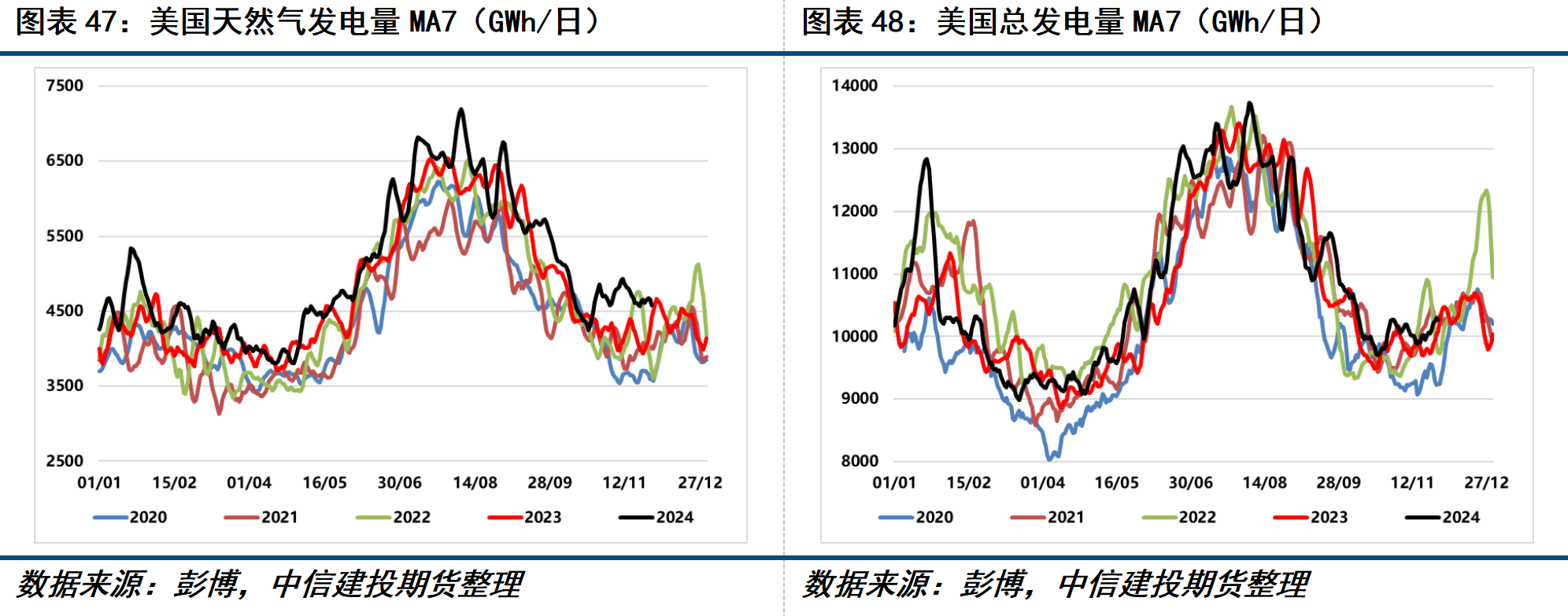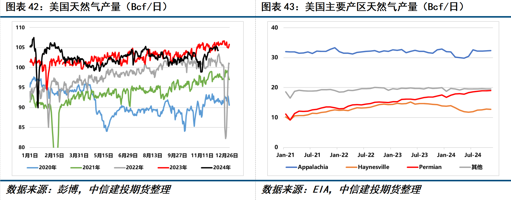 2025年美国天然气生产商主动减产概率较低。2024年的主动减产行为较多,如Chesapeake在2月21日宣布全年缩减20%的资本开支和15%的产量。EQT在3月4日宣布3月每天减产1Bcf,随后又多次宣布延长减产。企业一般不会在财报等中长期规划中表达减产意愿,而是通常在价格偏低时被迫宣布减产。Chesapeake、EQT等主流生产商的完全成本在2.2美元/MMBtu左右,折合Henry Hub盘面价格会略高。从2024年的现实情况观察,当盘面接近这一价格水平后均有减产行为发生。展望2025年,我们认为LNG出口与发电需求的增长将改善美国天然气供需平衡,天然气价格难以再度跌至迫使生产商减产的水平,美国天然气产量将重新回到增长轨道。