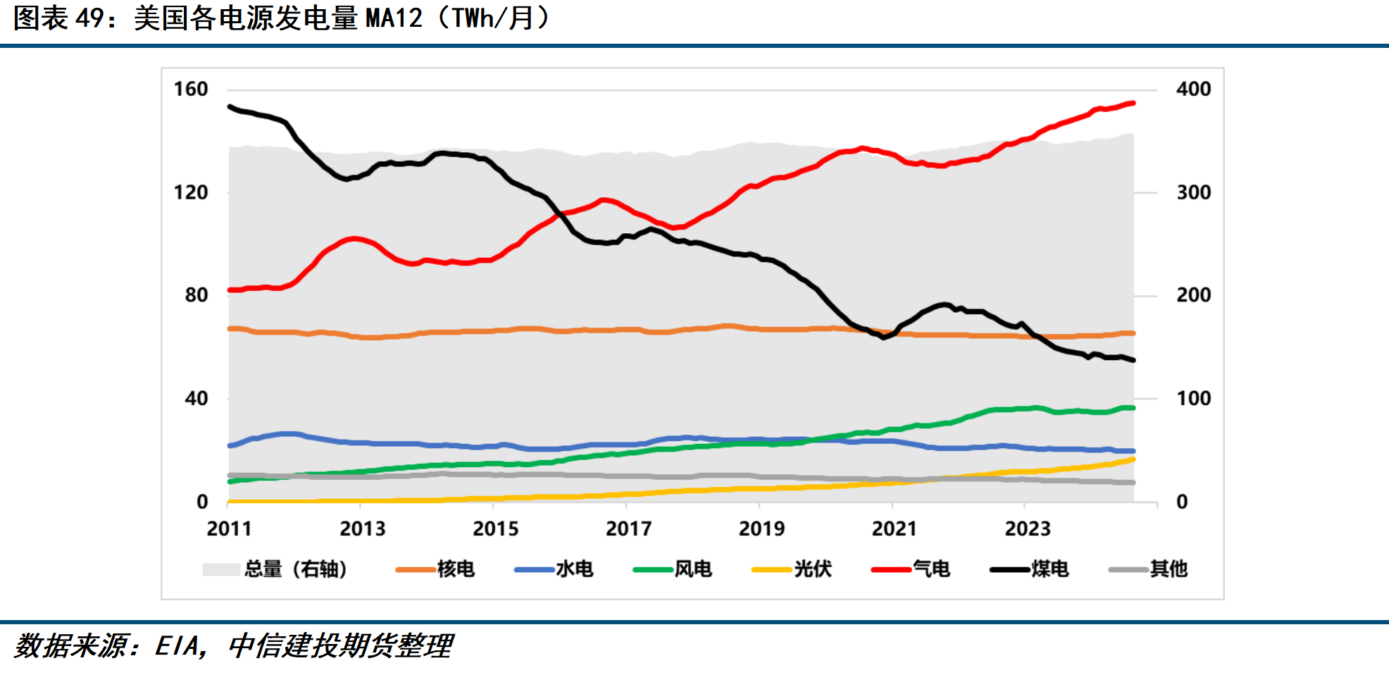 数据中心将驱动美国气电增长。我们认为美国发电部门天然气需求受到三大利好支撑:一是美国电力行业可再生能源占比还较低,主要的电力结构转变是气电对煤电的替代,气电占比仍处于上升通道。二是伴随人工智能行业的快速发展,数据中心的建设将重新驱动美国电力需求增长。三是美国大部特别是气电占比较高的中南部愈发炎热,夏季电力需求屡创新高,2024年得州电网负荷几度刷新历史极值。McKinsey认为美国数据中心电力需求将由2024年的25GW增长至2030年的80GW,相当于使美国的总电力需求在目前350TWh/月的基础上提升40TWh/月,折合年化增速1.7%,这对于电力需求在很长时间内近乎零增长的美国而言已经是不小的数字。美国天然气行业普遍认为,由于兼具廉价、稳定、灵活等优势,数据中心将首选天然气作为电力来源,如EQT估计到2030年美国发电部门天然气需求将提升10-18Bcf/d,相当于在目前水平基础上增长27%-50%,其中大部分将来自数据中心的贡献。