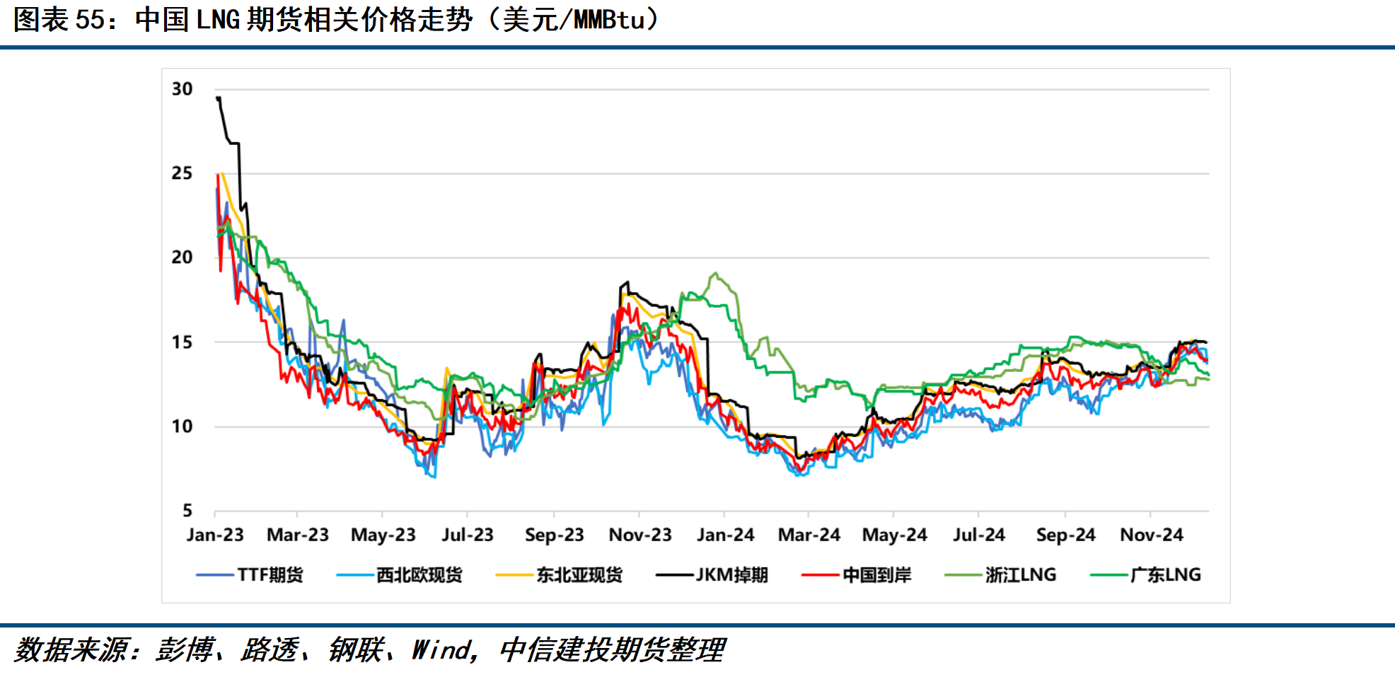 复盘2024年TTF行情:2023年10月-2024年2月:TTF处于漫长的下跌之中,在史无前例的暖冬与高库存下,由地缘局势紧张所推升的TTF最终向基本面低头,从超过50欧元的高点一路下跌至23欧元,20-25欧元/MWh是美国LNG到达欧洲的成本区间,2023年三次到达该区间TTF均迎来反弹,2024年2月中旬TTF亦于本区间见底。3月-4月:随着美联储释放宽松预期、中美制造业PMI共振回升,全球市场宏观情绪显著转强,各类大宗商品价格迎来普遍上涨,TTF跟随商品大盘迎来本年度第一波较大幅度的上涨,虽然马上跟随回落,但底部已有所抬升至28欧元。全球LNG供需紧张的状况初现端倪,价格的抬升并没有减弱欧洲以外的采买热情,坚挺的南亚-东南亚买盘为价格的底部抬升提供了支撑。5月-6月:Gazprom与OMV法律纠纷发酵,消息面供给冲击驱动TTF迎来第二波上涨。随后由于夏季电力需求过于疲弱,TTF经历了一轮漫长回调。不过本轮回调的底部又有所抬升至 32欧元,南亚-东南亚需求保持旺盛、埃及开始大幅增加进口支撑了此时的全球LNG市场。7月-8月:供给冲击接连不断,先是以色列与伊朗对抗骤然升级,后是乌克兰攻入俄罗斯本土占领天然气计量站,TTF迎来年内第三波上涨至40欧元。随着地缘冲击与挪威检修逐渐结束,TTF再次深度回调至32欧元。9月-10月:东亚LNG进口显著增加,欧洲的降温过程相较2022-23年也有所提前,市场开始对更冷的冬季和更早的去库进行定价,叠加中东地缘局势的再度升温,TTF重新上涨至40欧元。在冬季天气环境不明朗的环境下,TTF价格开始跟随近端天气现实大幅波动。11月-12月:欧洲遭遇无风期导致气电需求突然大增、降温过程仍在继续、LNG进口持续低迷,这些都使得欧洲天然气库存快速去化,叠加Gazprom与OMV仲裁结束,Gazprom可能提前断供的消息助力市场,TTF迎来本年度最后一波上涨,到达接近50欧元的高位。需求端的阶段性利好消退后,愈发确定的暖冬环境、全球LNG市场转向宽松开始推动TTF快速回调。